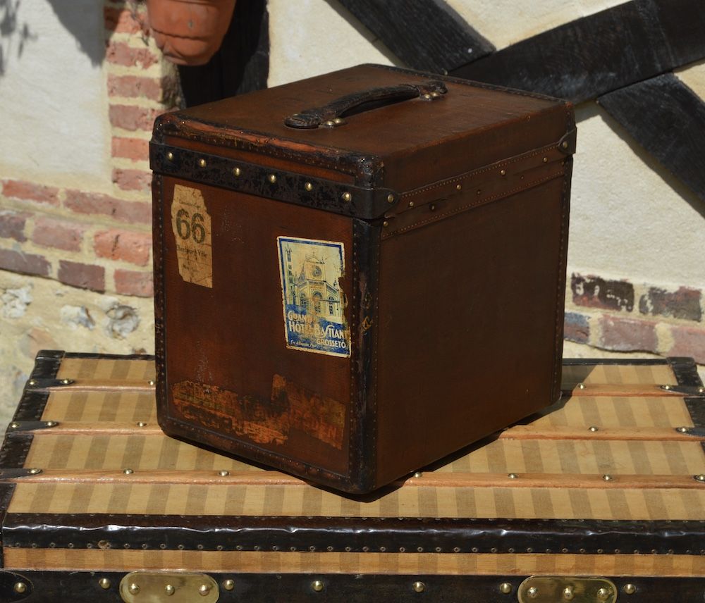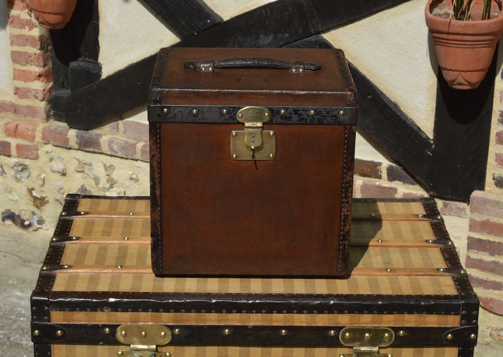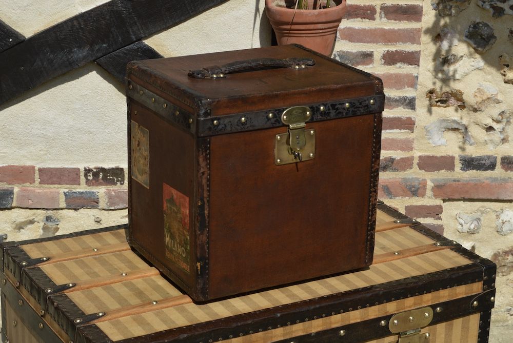 Charmante petite malle à chapeau Louis Vuitton des années 1900, protégée par des bordures en cuir et équipée d'une serrure en laiton signé Louis Vuitton. La malle est recouverte d'une toile enduite marron, originellement utilisée pour les malles de campagne.