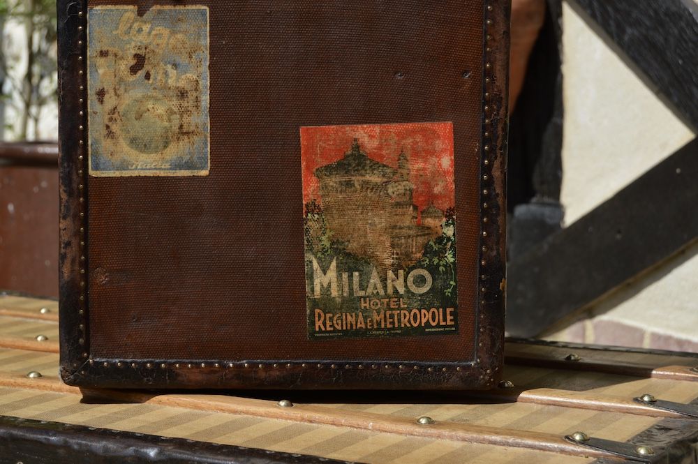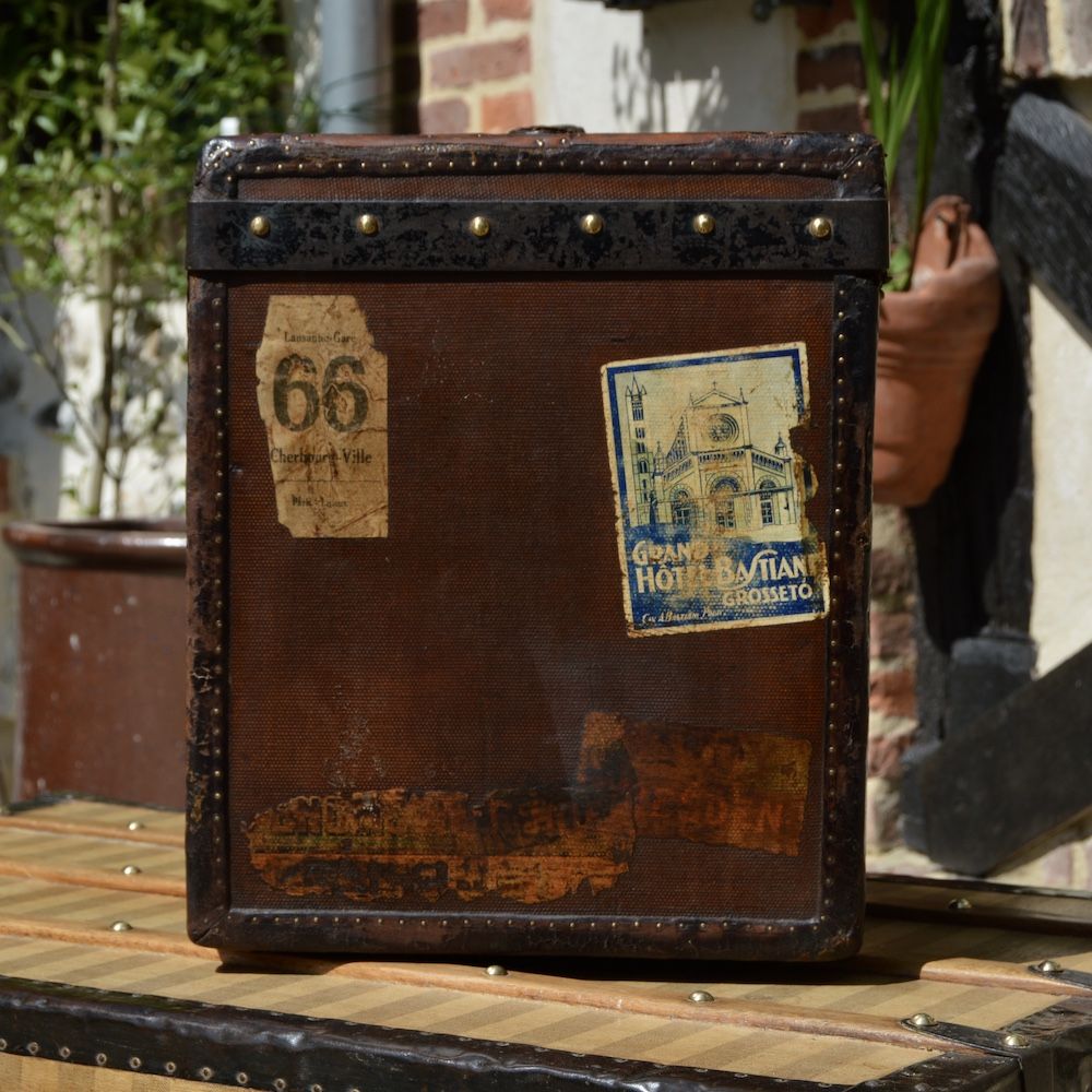 On retrouve de nombreuses étiquettes d'hôtel sur les côtés de la malle, ainsi que les initiales J.C sur le dessus. Une poignée en cuir est fixéé sur le dessus.