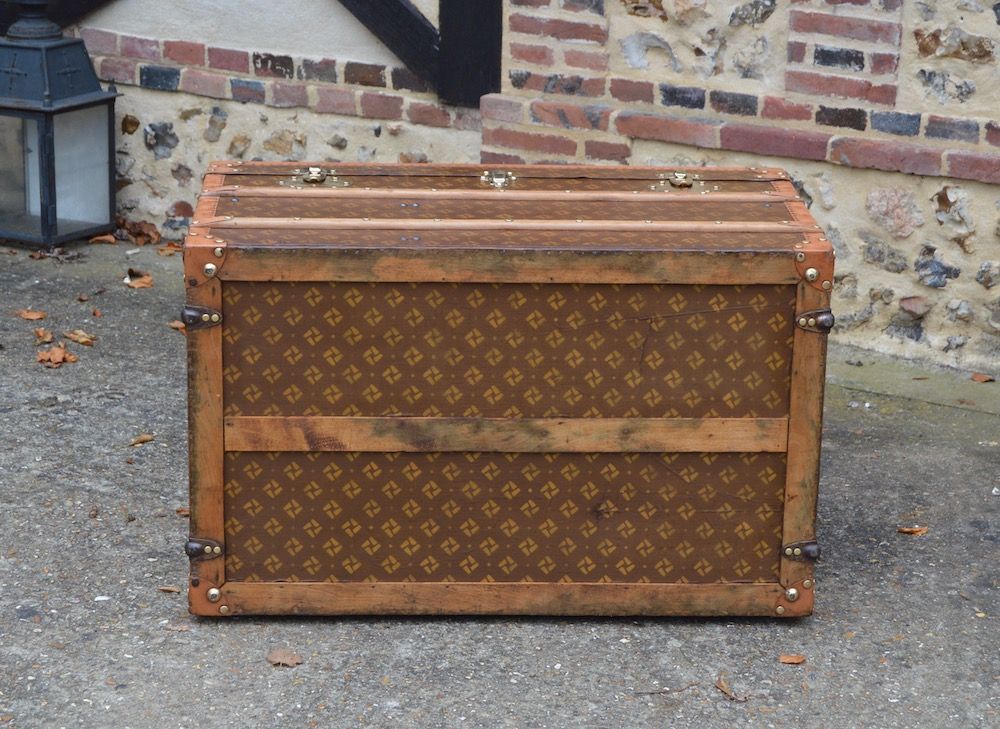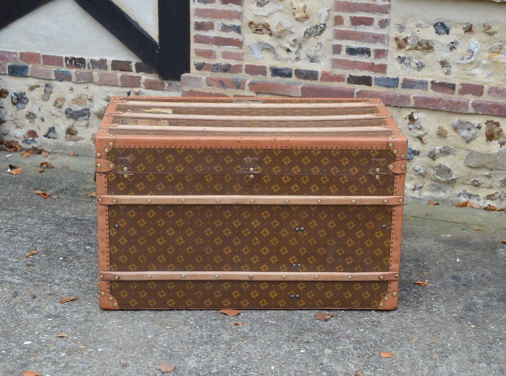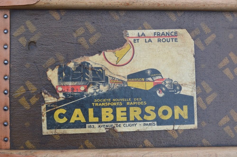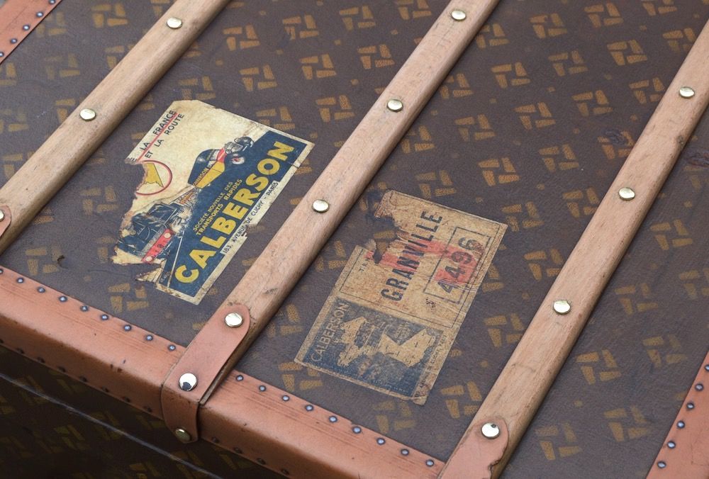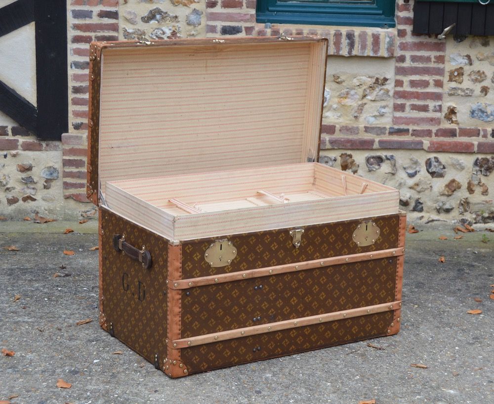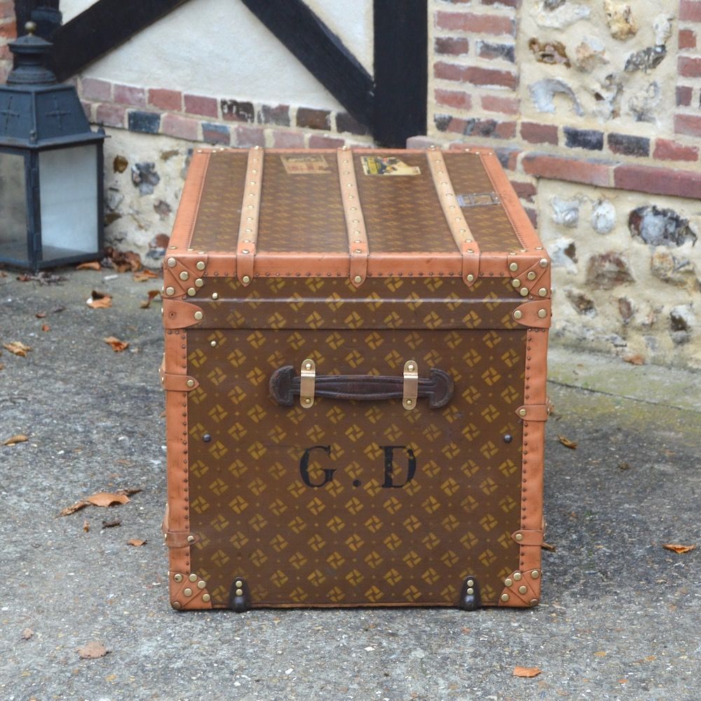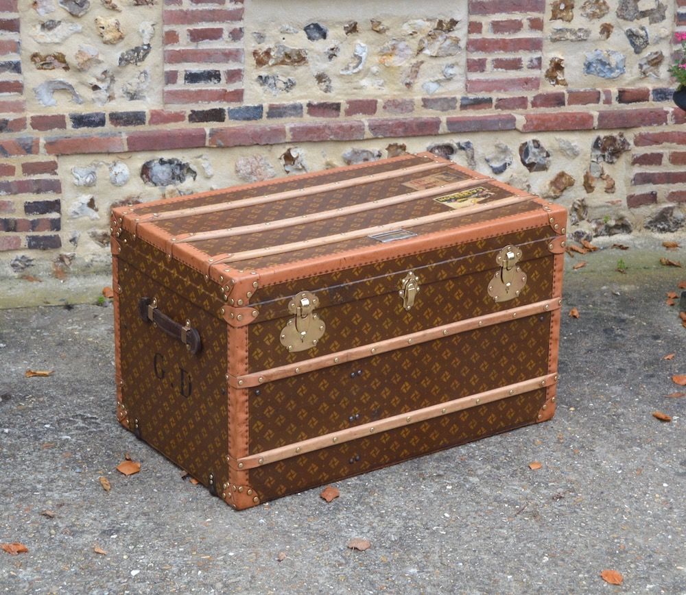 Superbe Malle Lovet des années 1930, recouverte d’une toile enduite monogramme et protégée par des bordures en fibre marron. La malle est équipée de lattes en hêtre, avec deux poignées en cuir et les initiales G.D du propriétaire d'origine peintes sur chacun des côtés. On remarque une belle étiquette de transport sur le dessus de la malle, témoignage d’un voyage depuis Paris vers Granville.