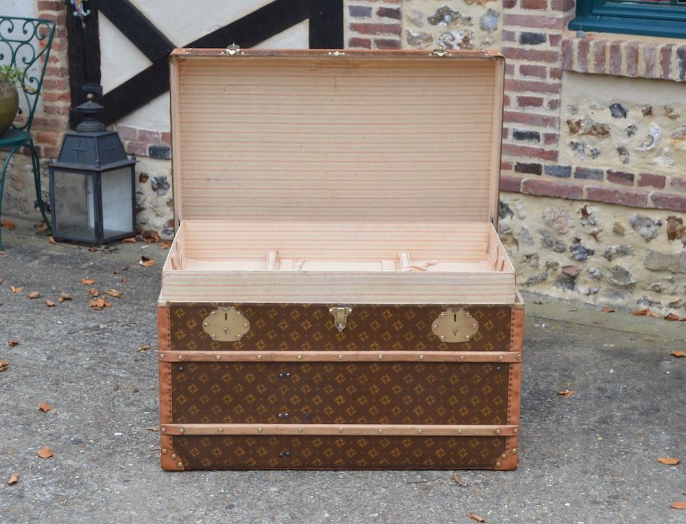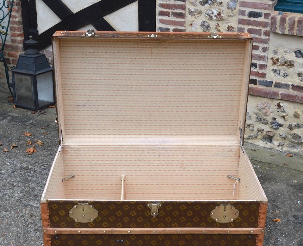 L’intérieur de la malle est recouvert d’une toile à motifs rayés rouge, avec les deux châssis d’origine pour ranger les vêtements. On remarque une séparation dans le fond du bagage pour entreposer les chapeaux.