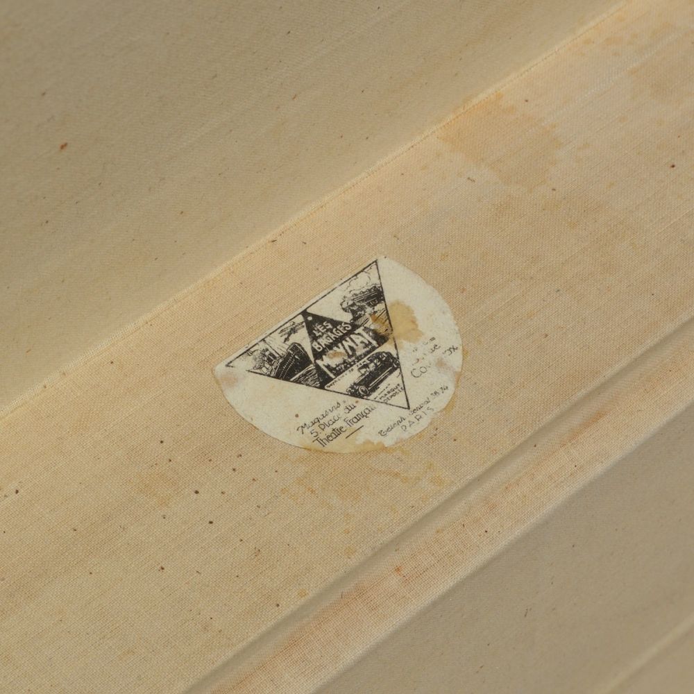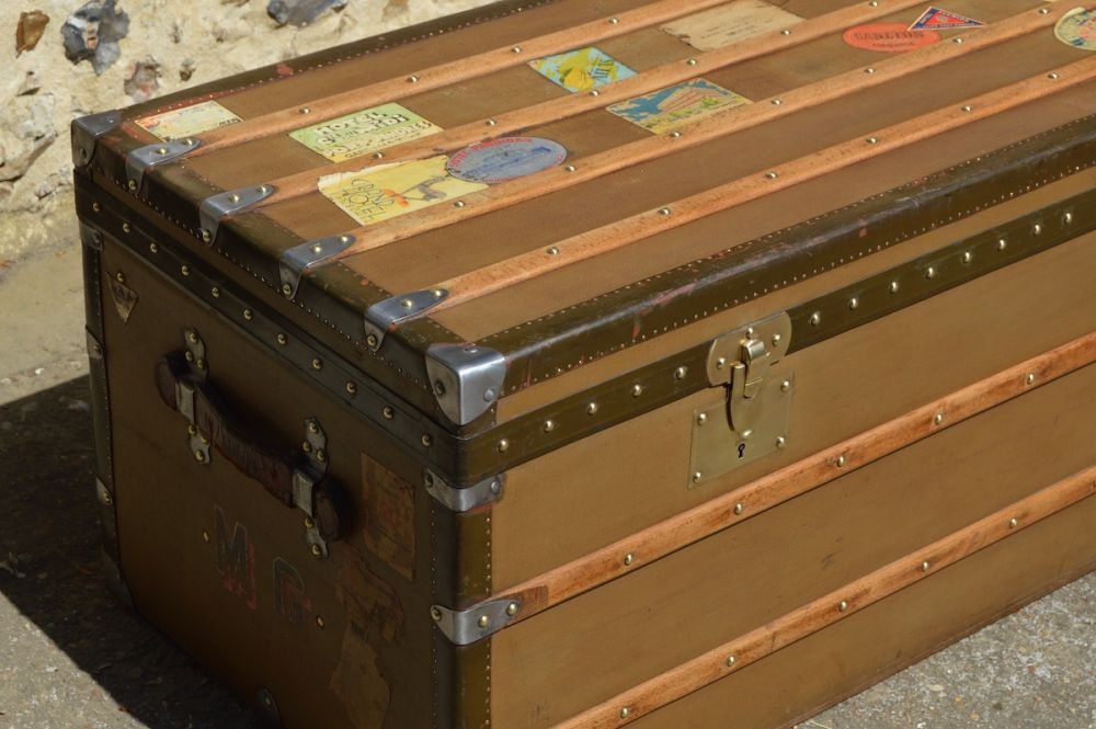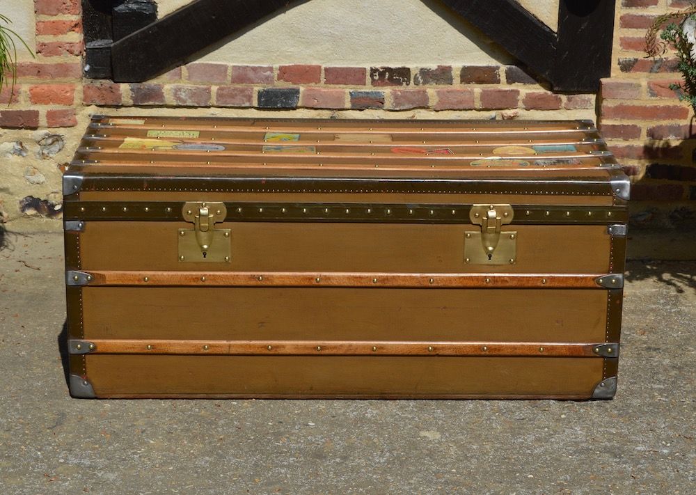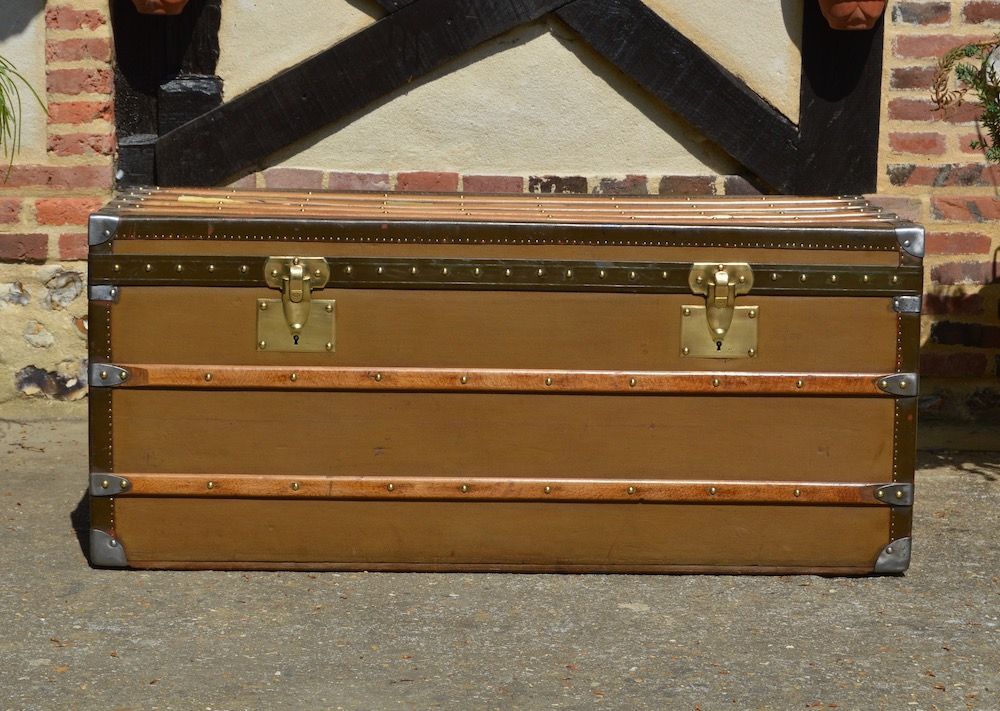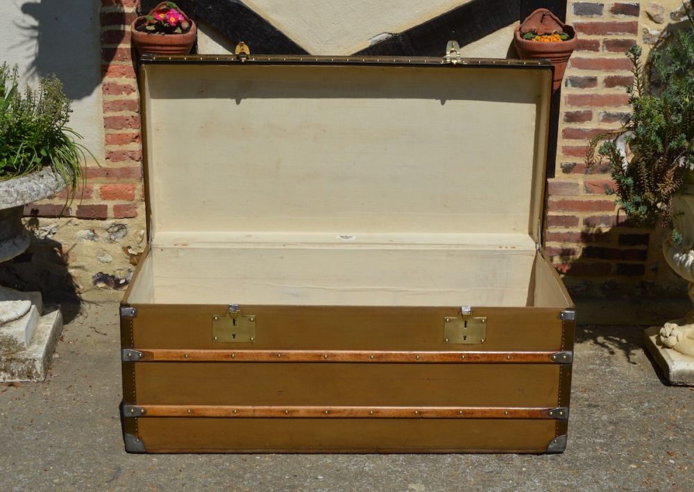 Les poignées en cuir et les enchapes sont signées Moynat. Les initiales du propriétaire d’origine M.G sont peintes en rouge de chaque cotés de la malle et une plaque d’authentification Moynat est cloutée sur le coté de gauche.