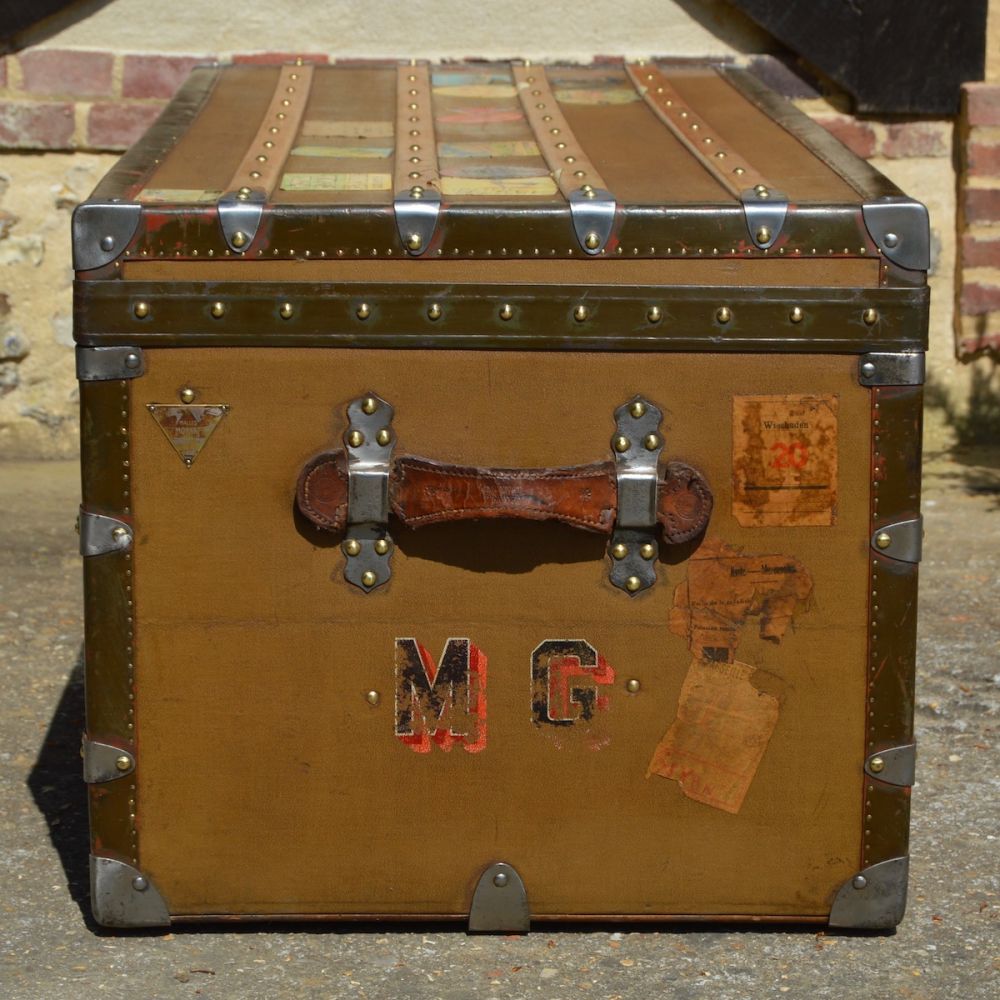 Grande malle courrier Moynat des années 1920 recouverte de toile enduite verte et protégée par des bordures lozine. On retrouve une série d’étiquettes d’hôtel collées sur le dessus de la malle et quelque étiquettes de transport sur les cotés.