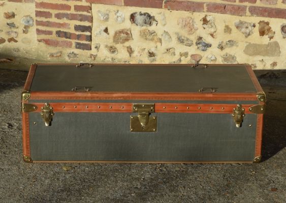 Très bon état : La malle est globalement en très bon état, avec une superbe patine de la toile extérieure. Quelques marques à l’intérieur.