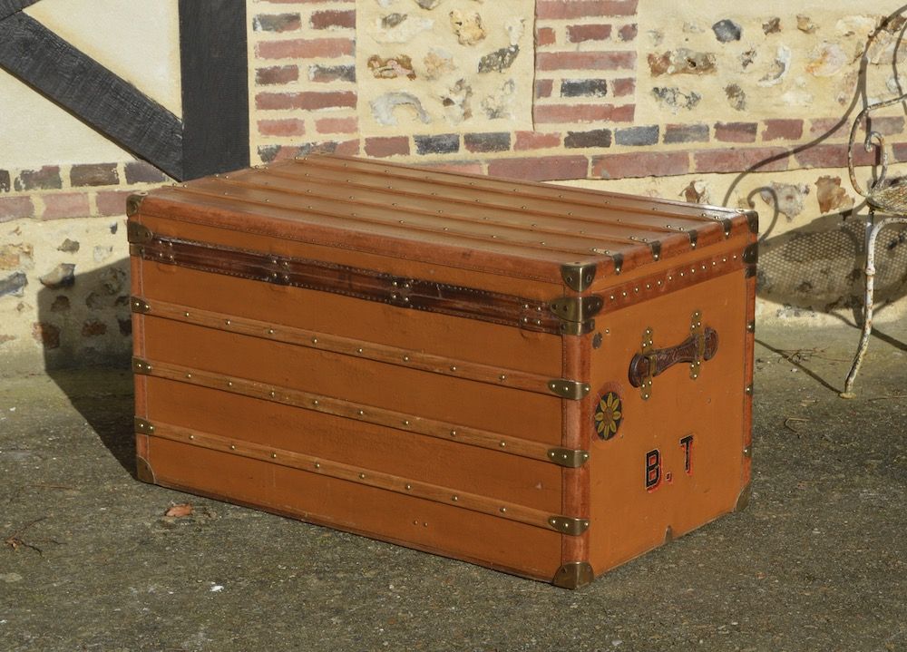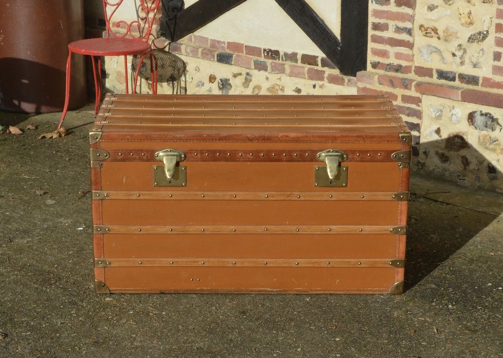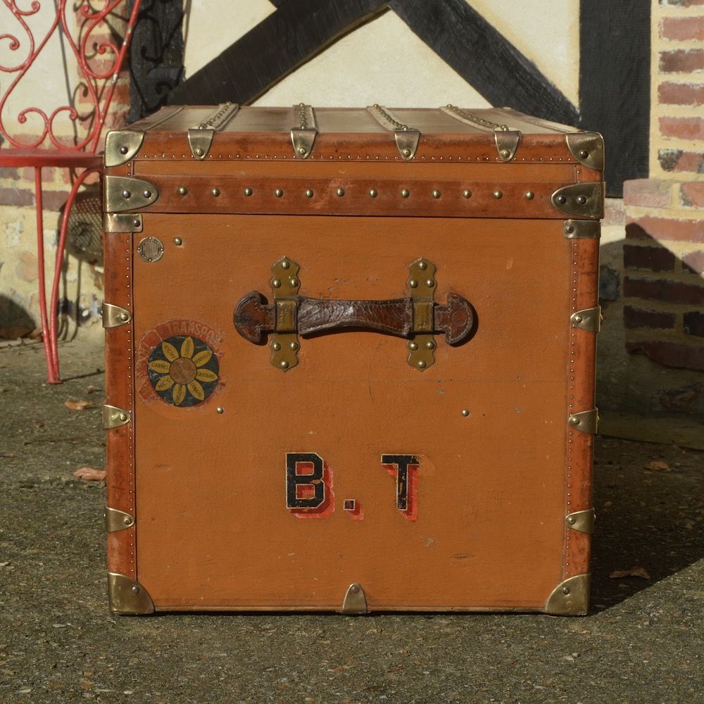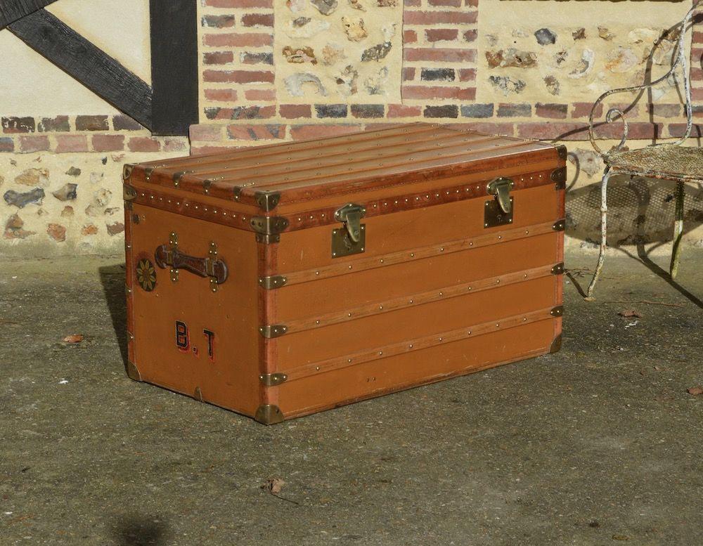 Très grande malle Moynat courrier, recouverte d’une toile enduite orange et protégée par des bordures lozine. La malle est équipée de deux fermoirs en laiton « langue de chat » emblématique de la marque. On retrouve une poignée en cuir sur chacun des côtés, avec les initiales B.T du propriétaire d’origine. La plaque d’authenticité MOYNAT est également visible, avec les adresses des magasins de l’époque.