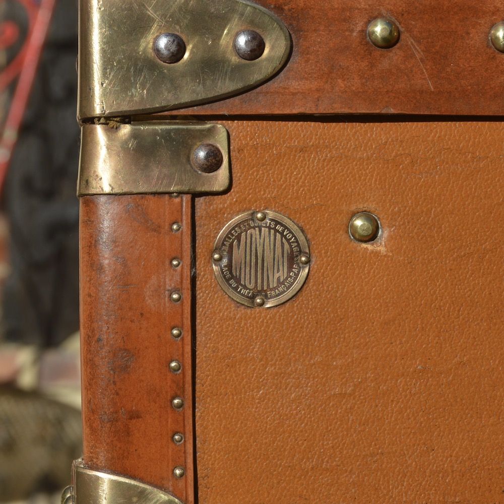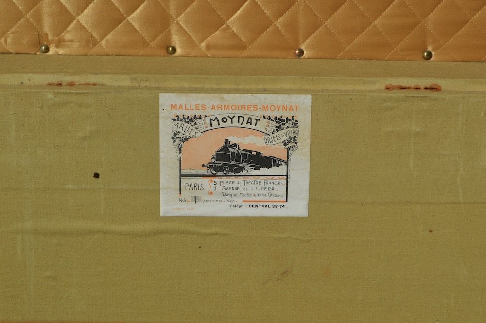 L’intérieur de la malle est propre, doublé d’une toile et d’une surface molletonnée. On retrouve l’étiquette du fabricant MOYNAT à l’intérieur du bagage, avec le numéro de téléphone de l’époque et les adresses des magasins.