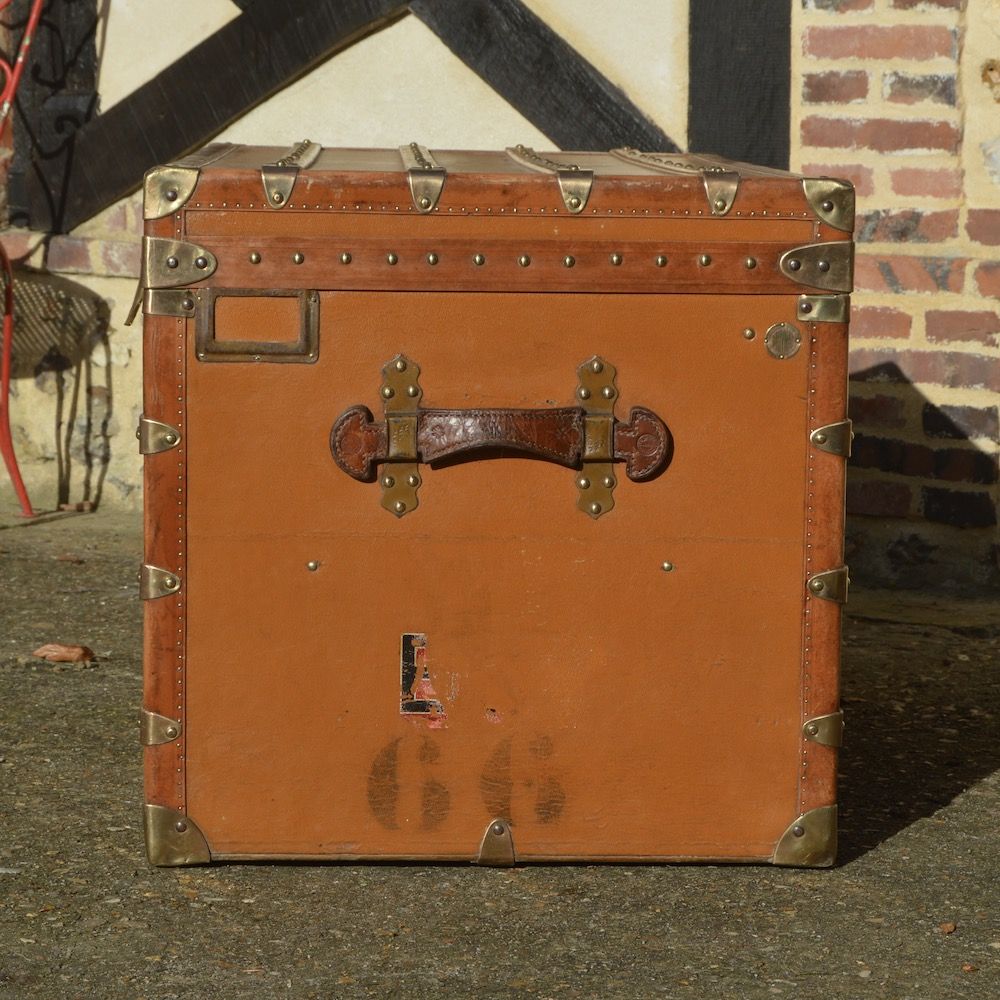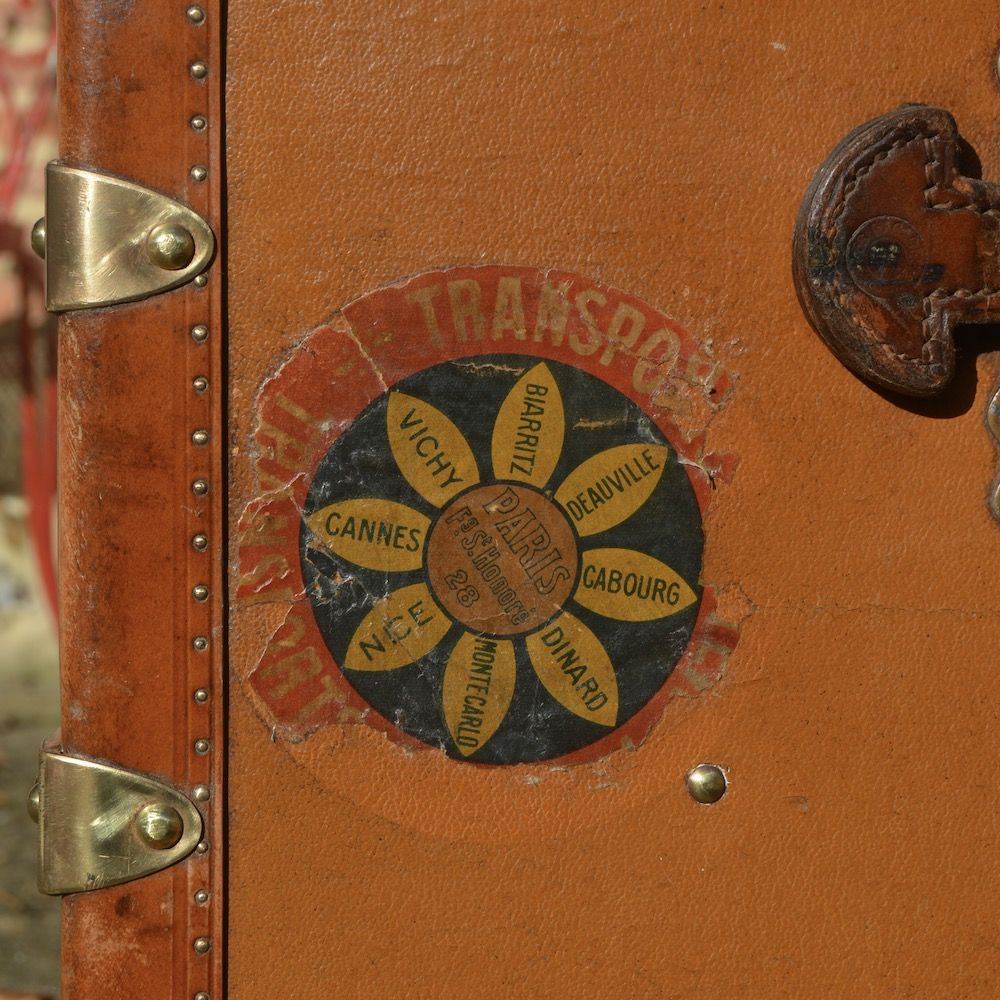 On remarque une très belle étiquette de transport sur le côté gauche, ainsi que le numéro 66 sur le côté droit la malle. Cette malle était probablement la 66e du client, nous imaginons le voyage…