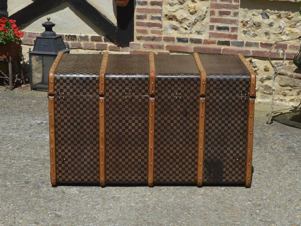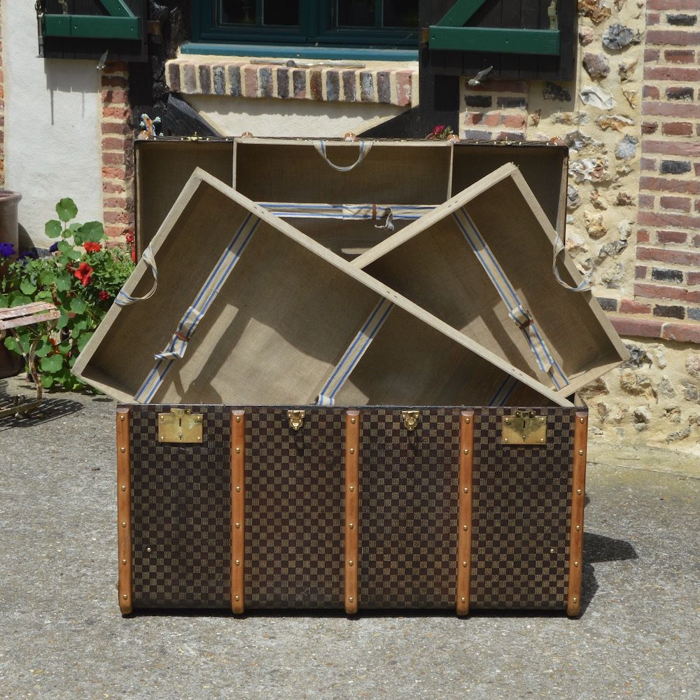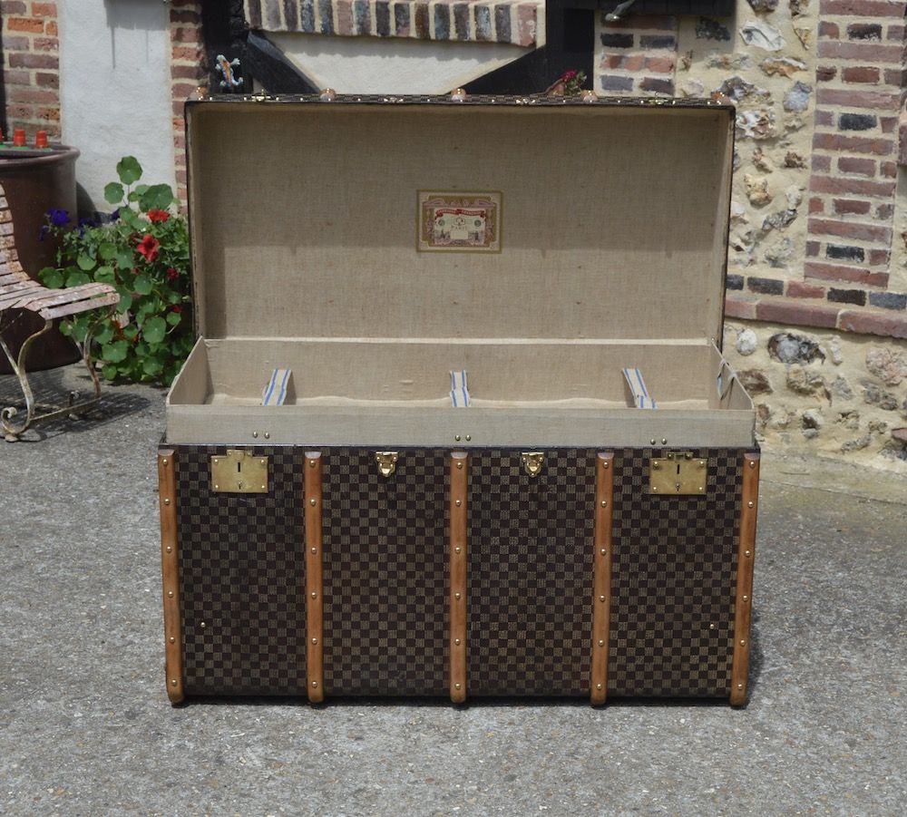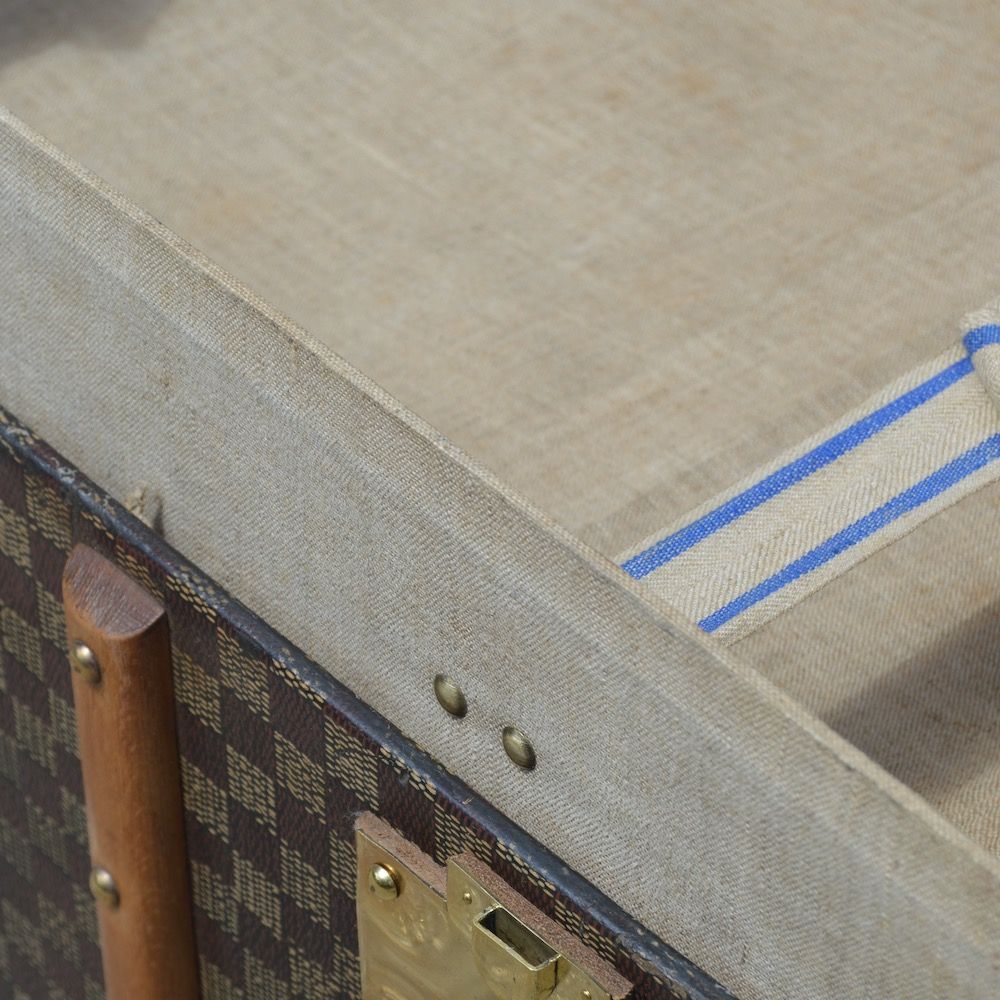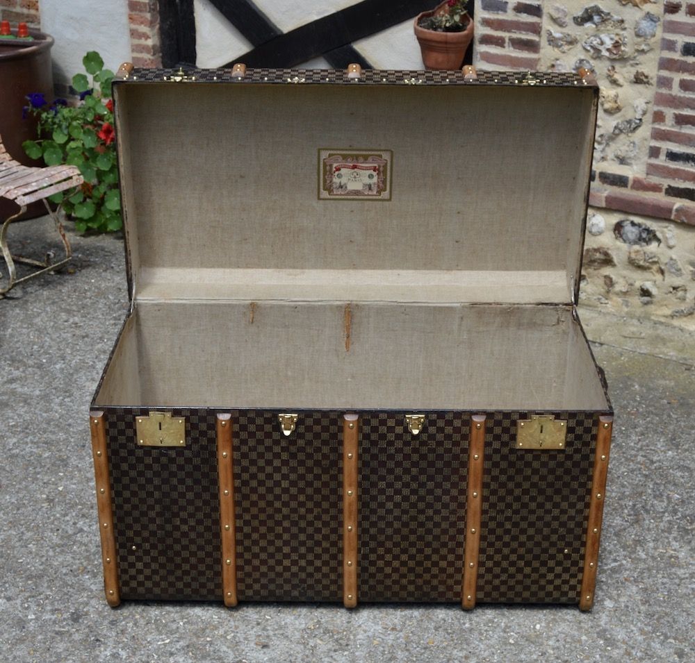 Très bon état : La malle est en superbe état, avec une très bonne conservation de la toile extérieure en damier. Il manque quelques morceaux de toile à l'intérieur mais elle est globalement très propre et entièrement d'origine. L'étiquette du vendeur est collée dans le couvercle.