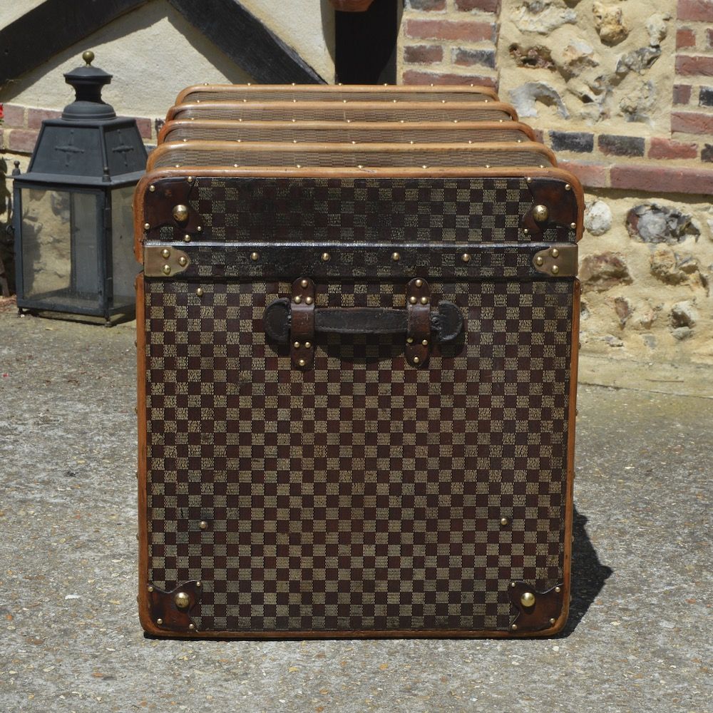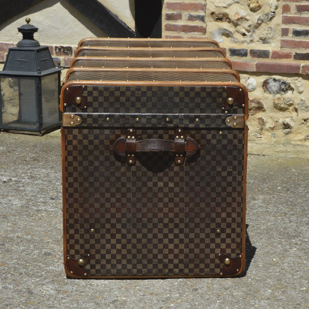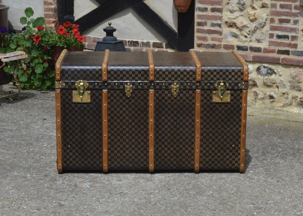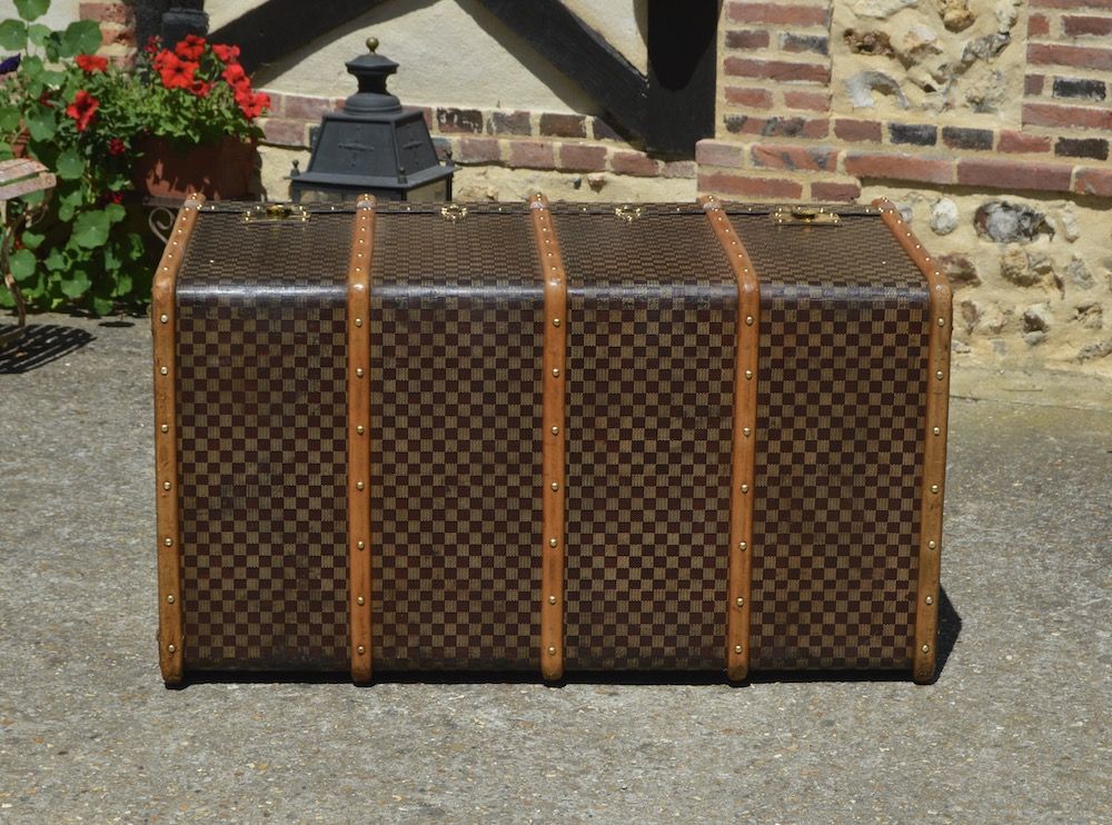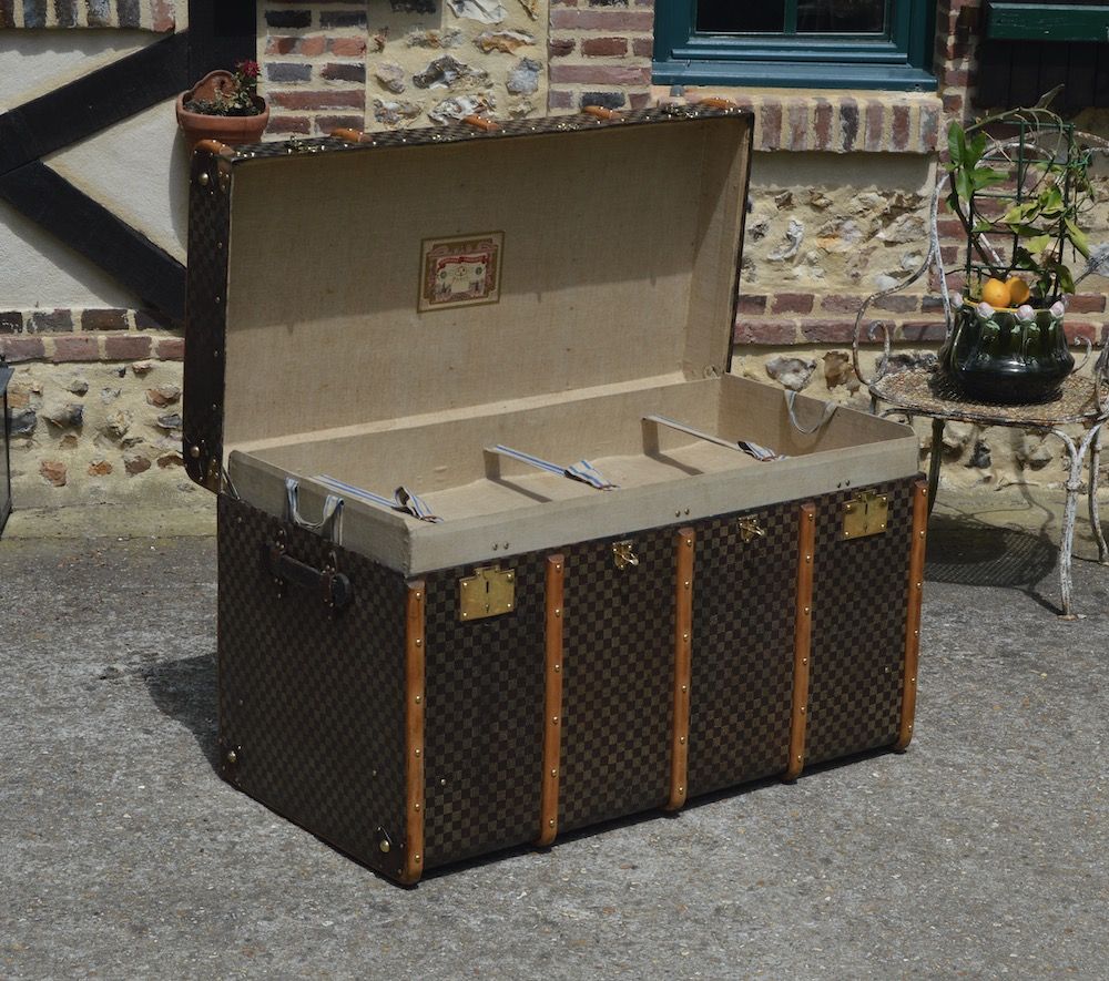Très bon état : La malle est en superbe état, avec une très bonne conservation de la toile extérieure en damier. Il manque quelques morceaux de toile à l'intérieur mais elle est globalement très propre et entièrement d'origine. L'étiquette du vendeur est collée dans le couvercle.