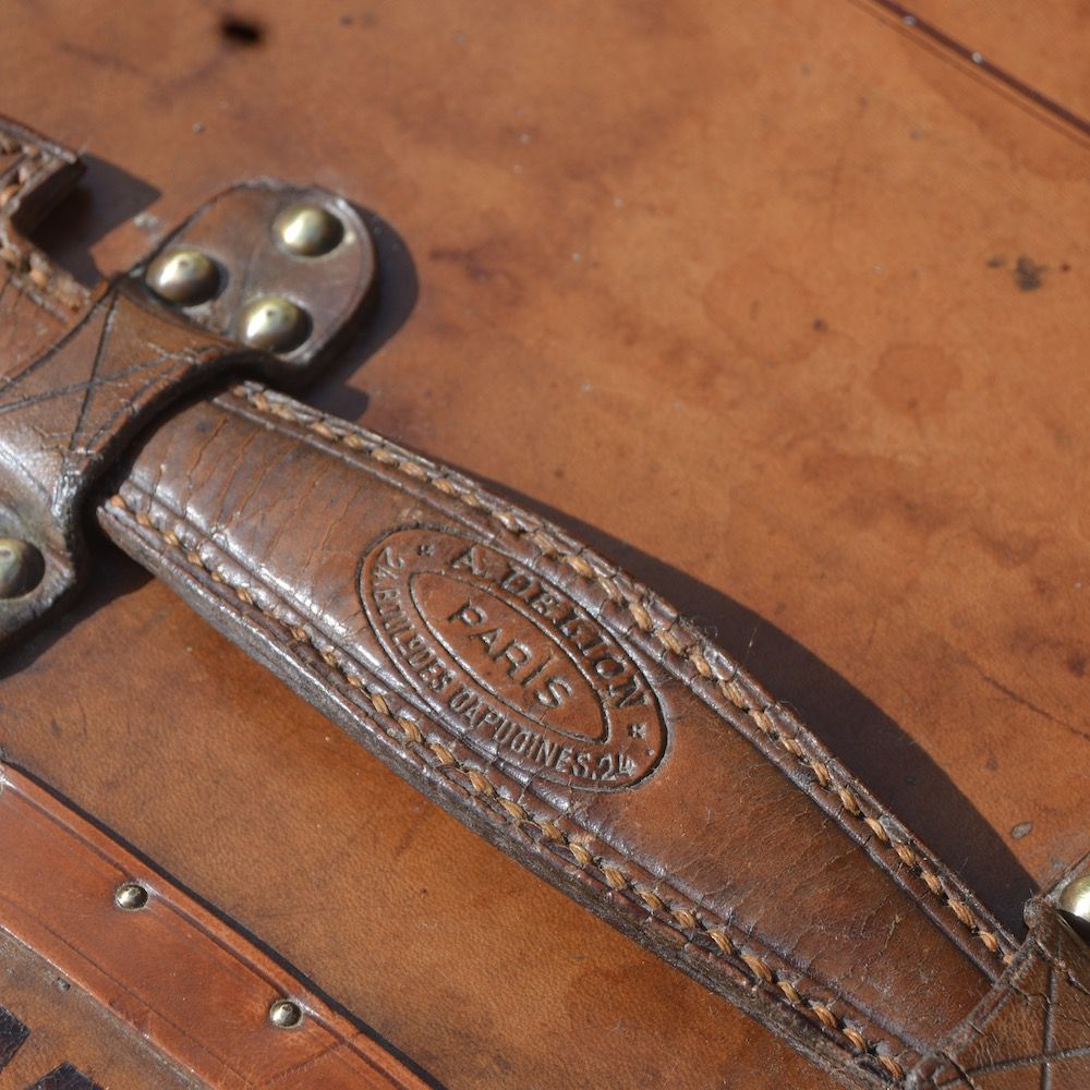 Très belle malle chapeaux de 1900 entièrement recouverte de cuir, de la marque Delion Paris. On retrouve une poignée en cuir estampillé Delion sur le dessus de la malle, avec un emplacement pour ranger une carte de visite, ainsi que les initiales M.A du client d'origine. La malle est équipée de fermoirs et bijouterie en laiton, avec la plaque d'authenticité sur la façade du bagage.