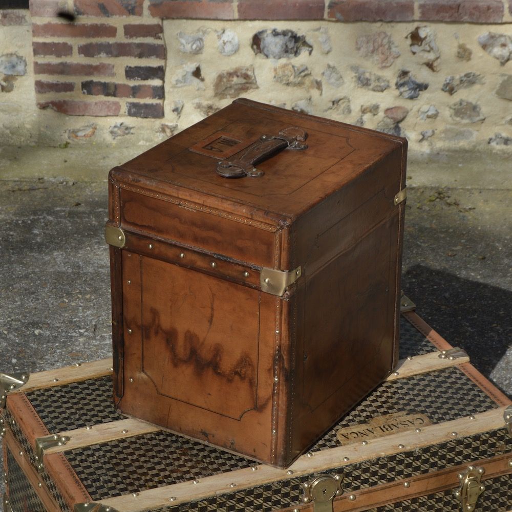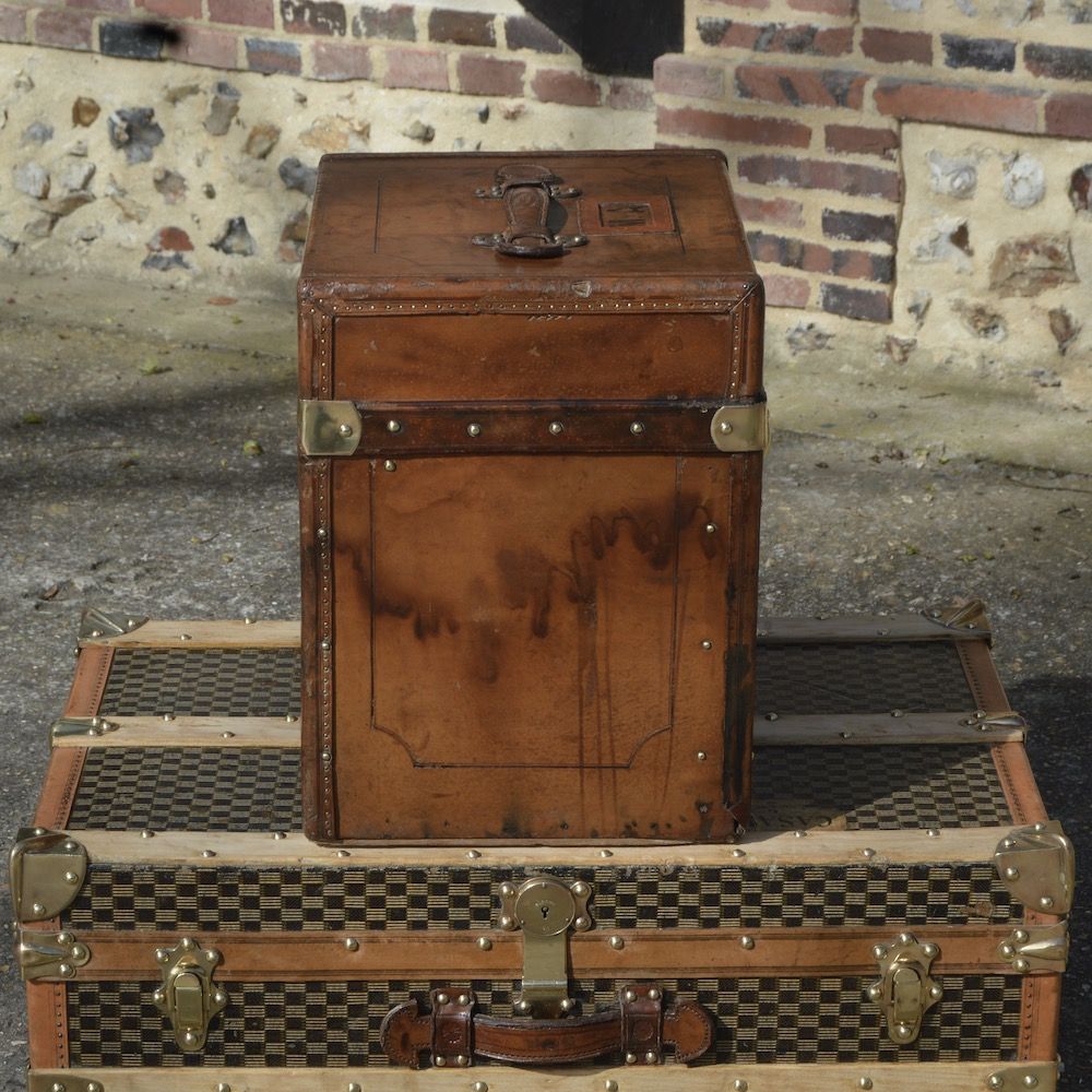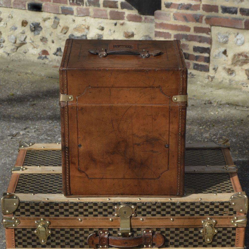 Bon état : Très belle patine du cuir extérieur. On remarque quelque manques/marques sur le revêtement extérieur et intérieur, mais l'objet est globalement en très bon état pour son âge. Une des fixations intérieures est remplacée par du ruban pour maintenir le chapeau melon de droite en place.