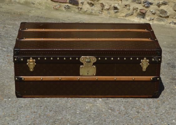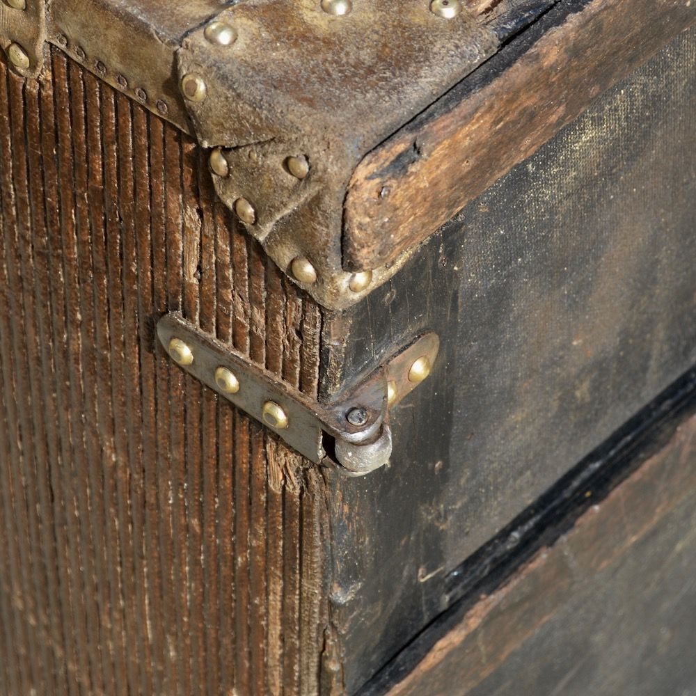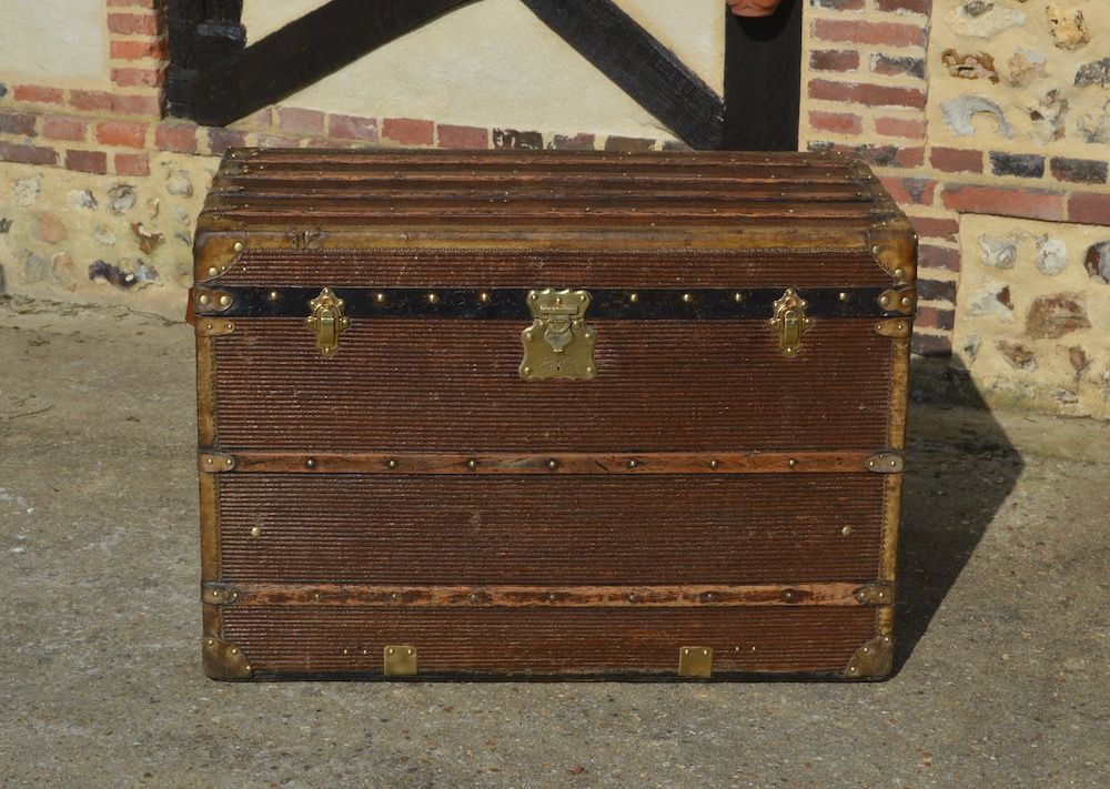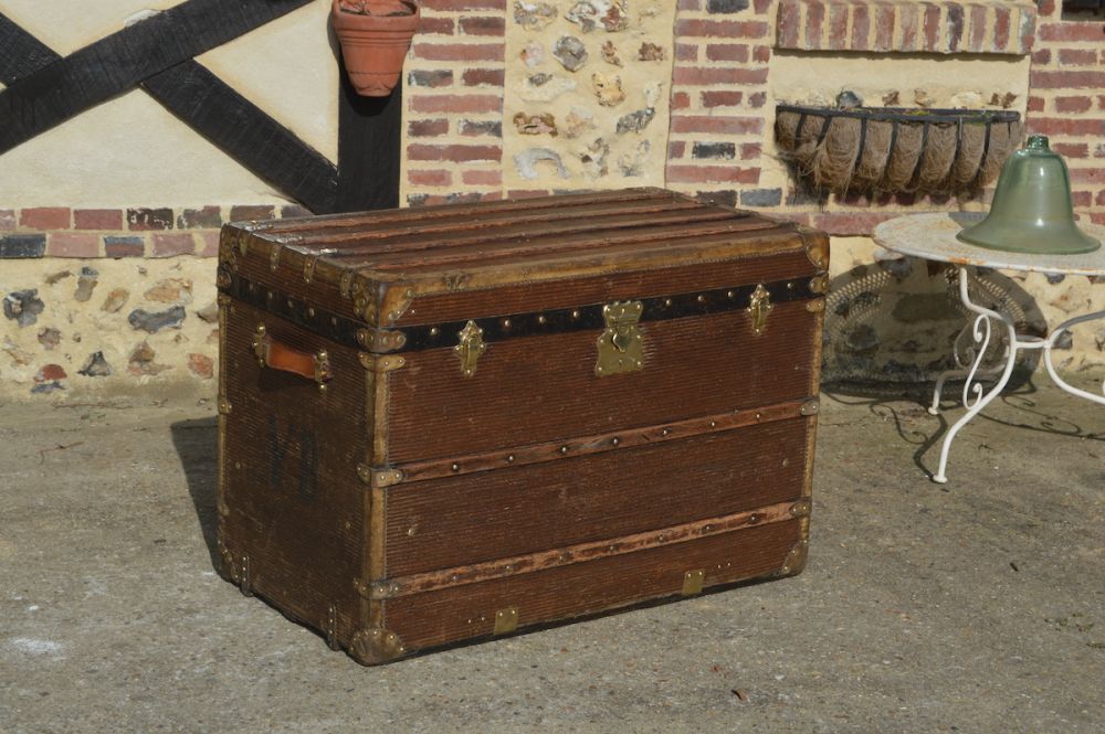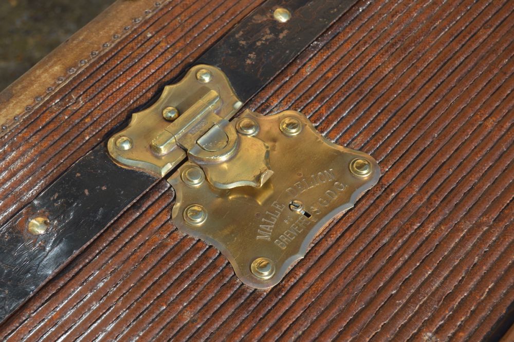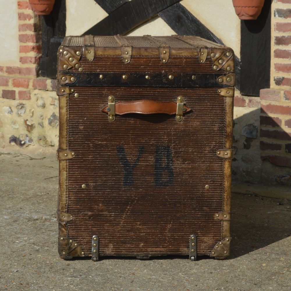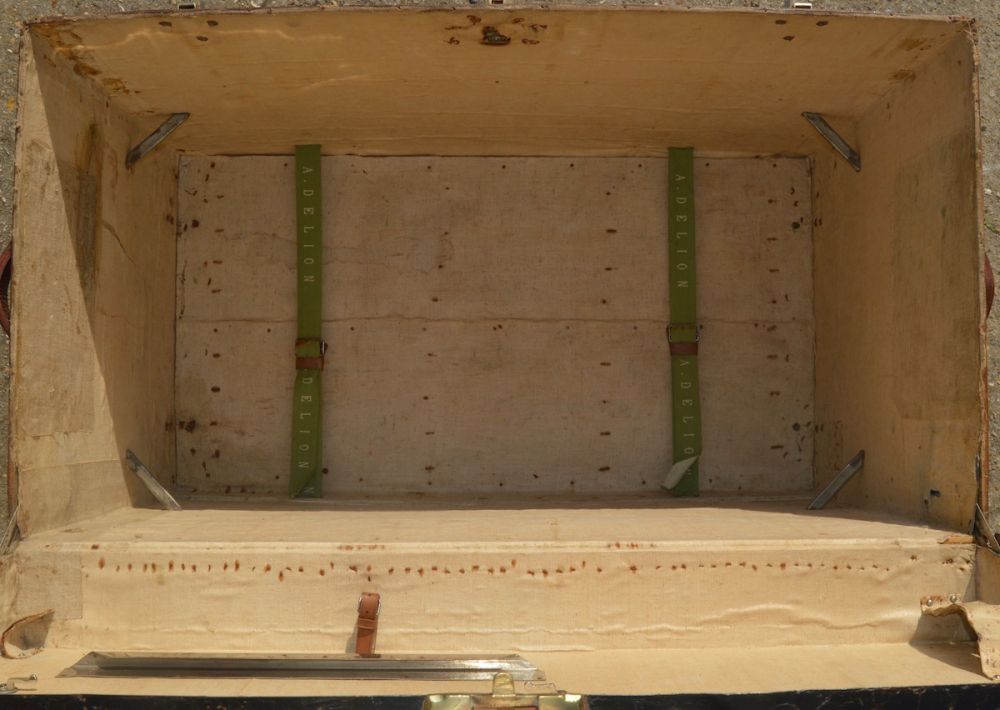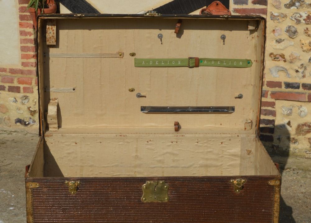 Etonnante malle haute Delion recouverte d’une toile enduite renforcée, vers 1900. La serrure centrale en laiton est signée Delion avec les différentes sangles intérieures. On remarque quatre roulettes sous la malle ainsi que les initiales V.B sur chacun des cotés.