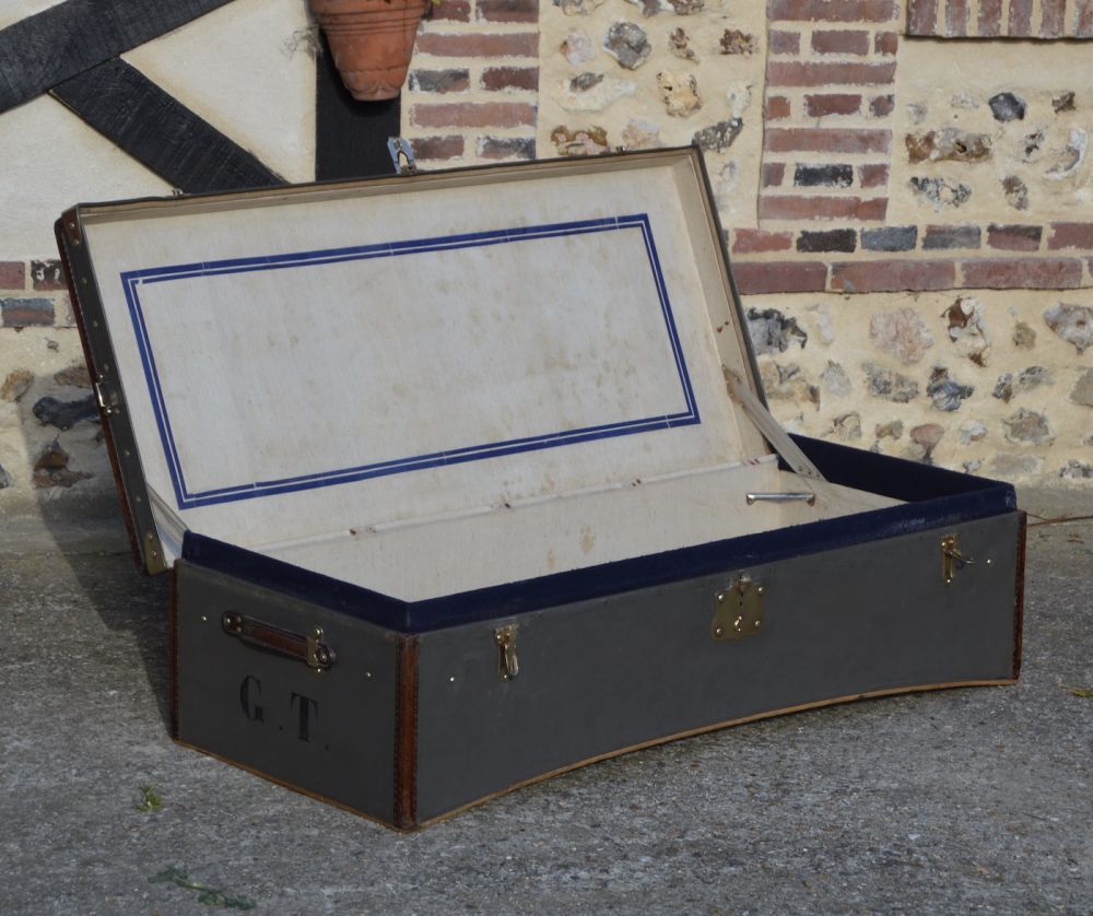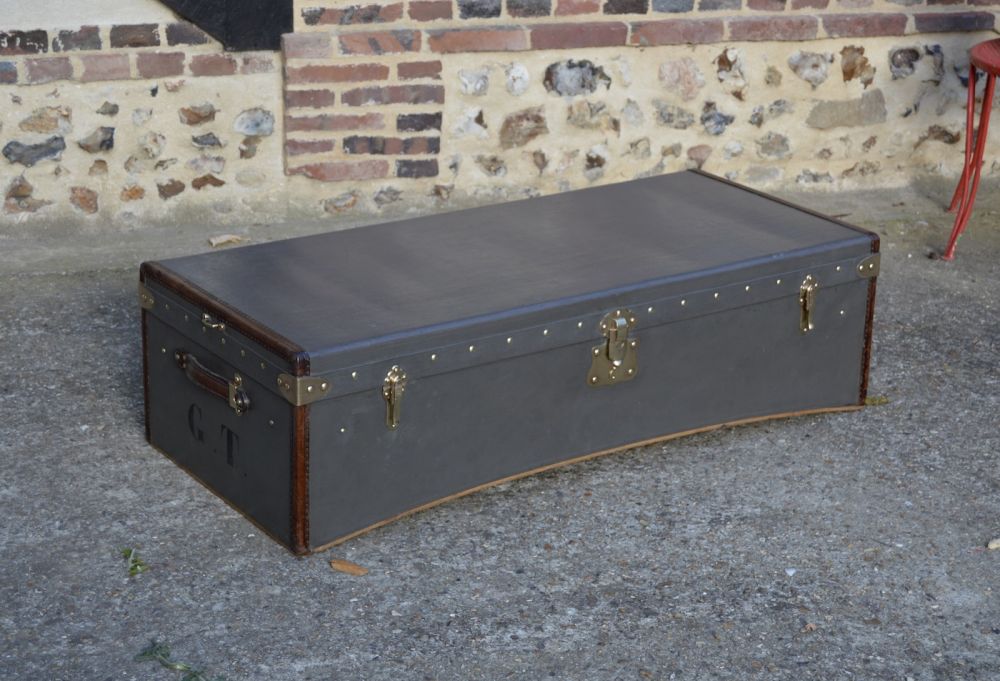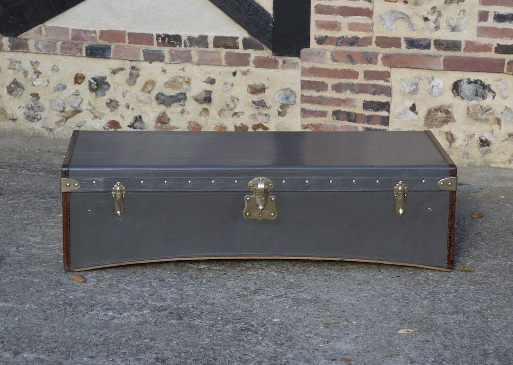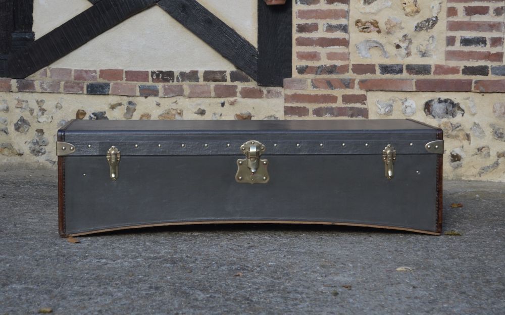 La forme galbée de la malle était originellement conçue pour épouser la forme du toit de la voiture et pour répartir le contenu du bagage de gauche à droite. `