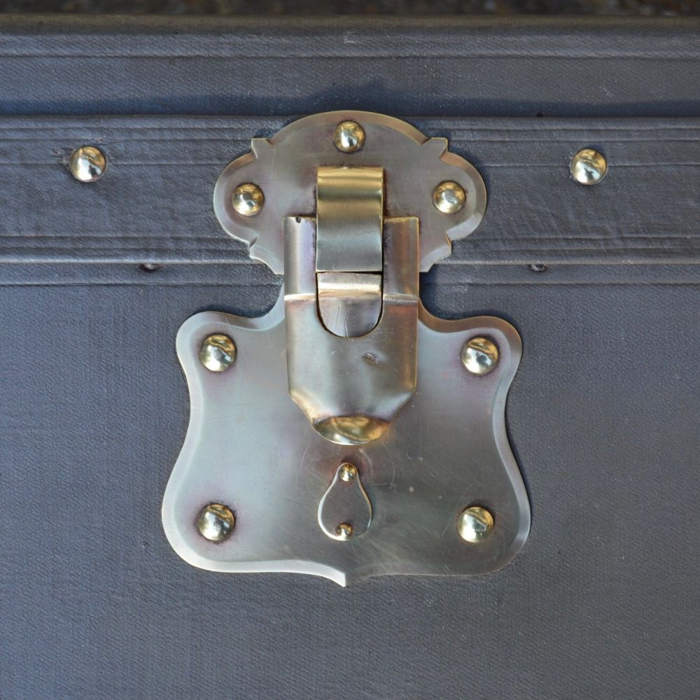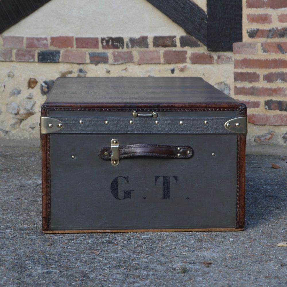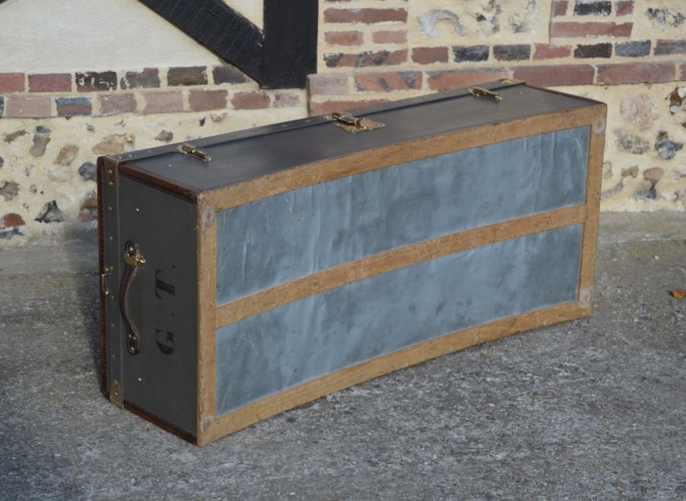 Très belle malle automobile limousine de la marque Aux Excursionnistes des années 1900. Recouverte d'une toile impermeable grise, on retrouve deux poignées en cuir sur chacun des cotés ainsi que trois fermoirs en laiton. Le fond du bagage est protégé par une plaque de zinc.