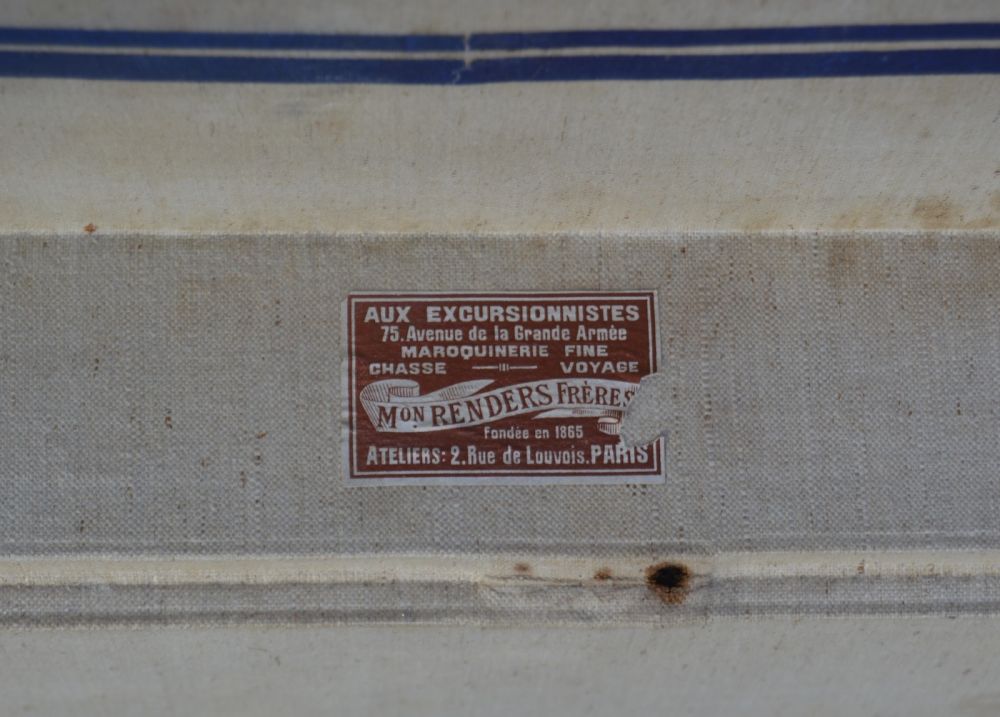 L'intérieur est tapissé d'un lin beige et l'étiquette du fabricant indique qu'il était spécialisé dans les articles de voyage haute de gamme.
