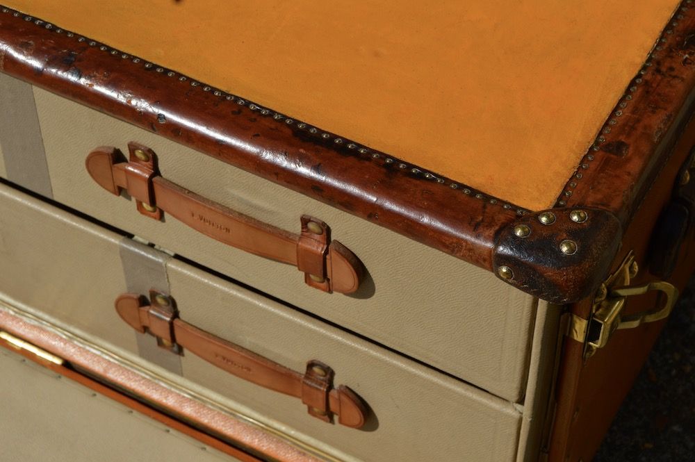 Grâce à une porte basculante, le client pouvait directement accéder à deux tiroirs aménagés sans déplacer la malle. On retrouve sur cette porte articulée l’étiquette du malletier Louis Vuitton ainsi que le numéro de fabrication de la malle. Un fermoir spécifique, créer pour ce model en particulier et signé de la maison Louis Vuitton permet de refermer la porte avec autant de sûreté qu’une serrure traditionnelle. Des crapauds en laiton sur chacun des côtés viennent solidifier cette fermeture.
