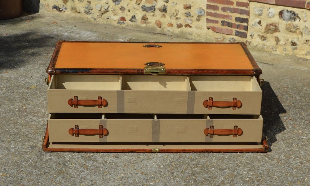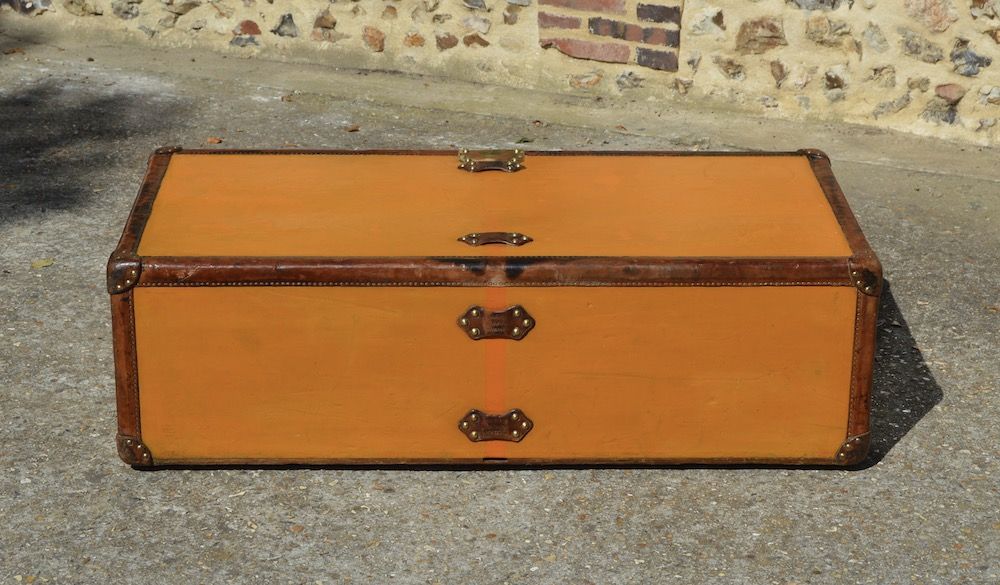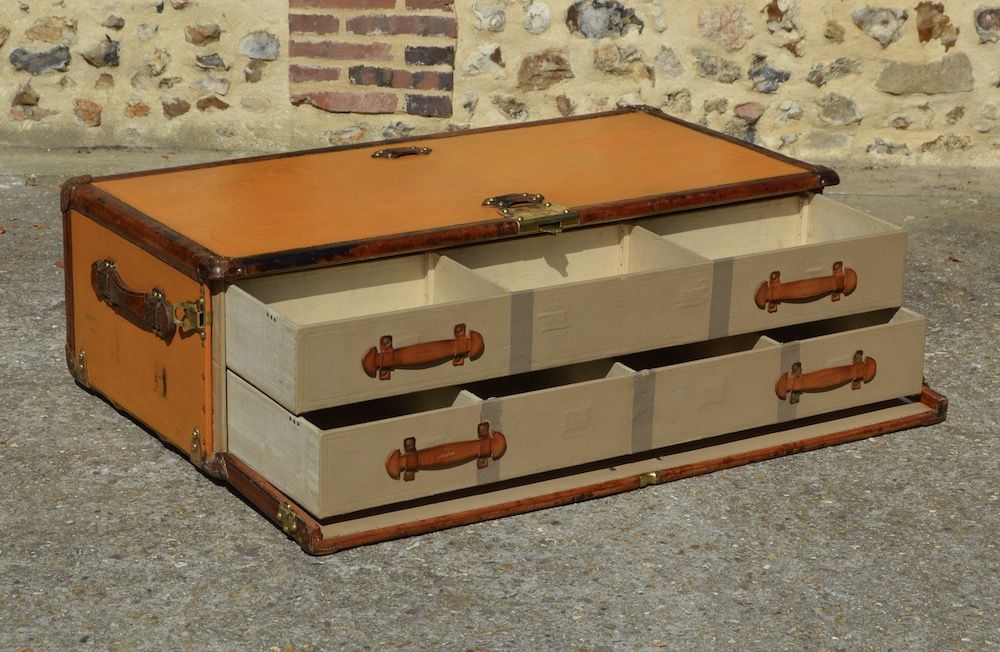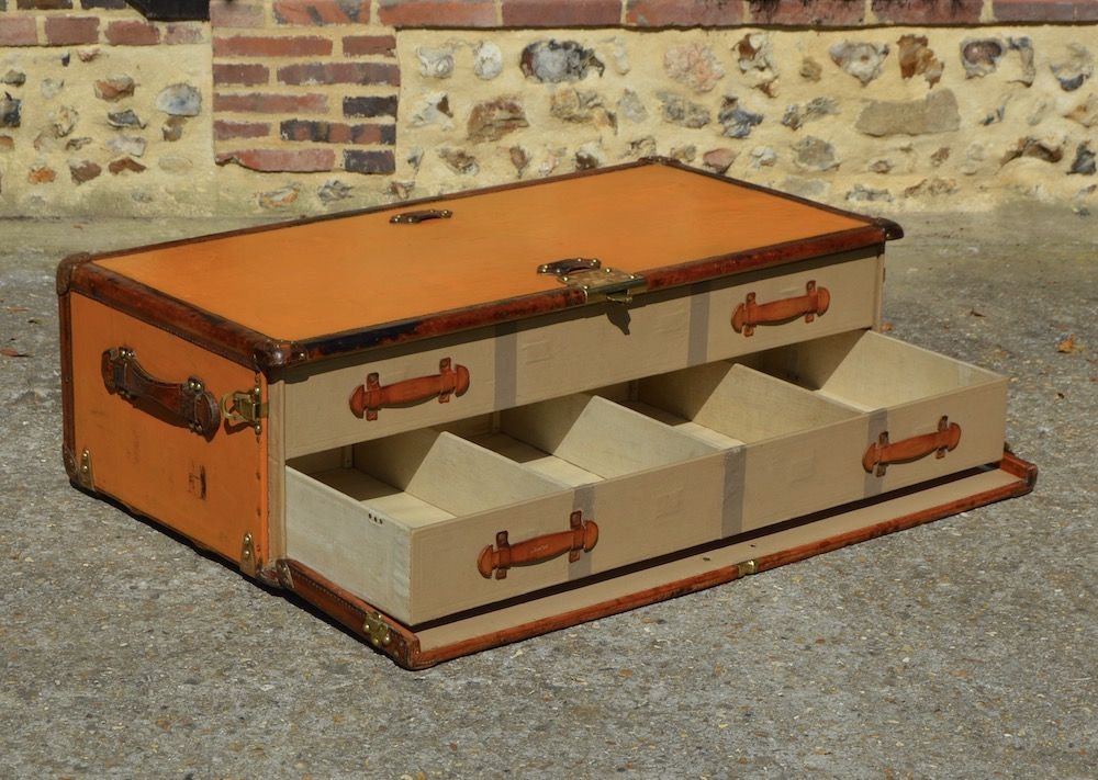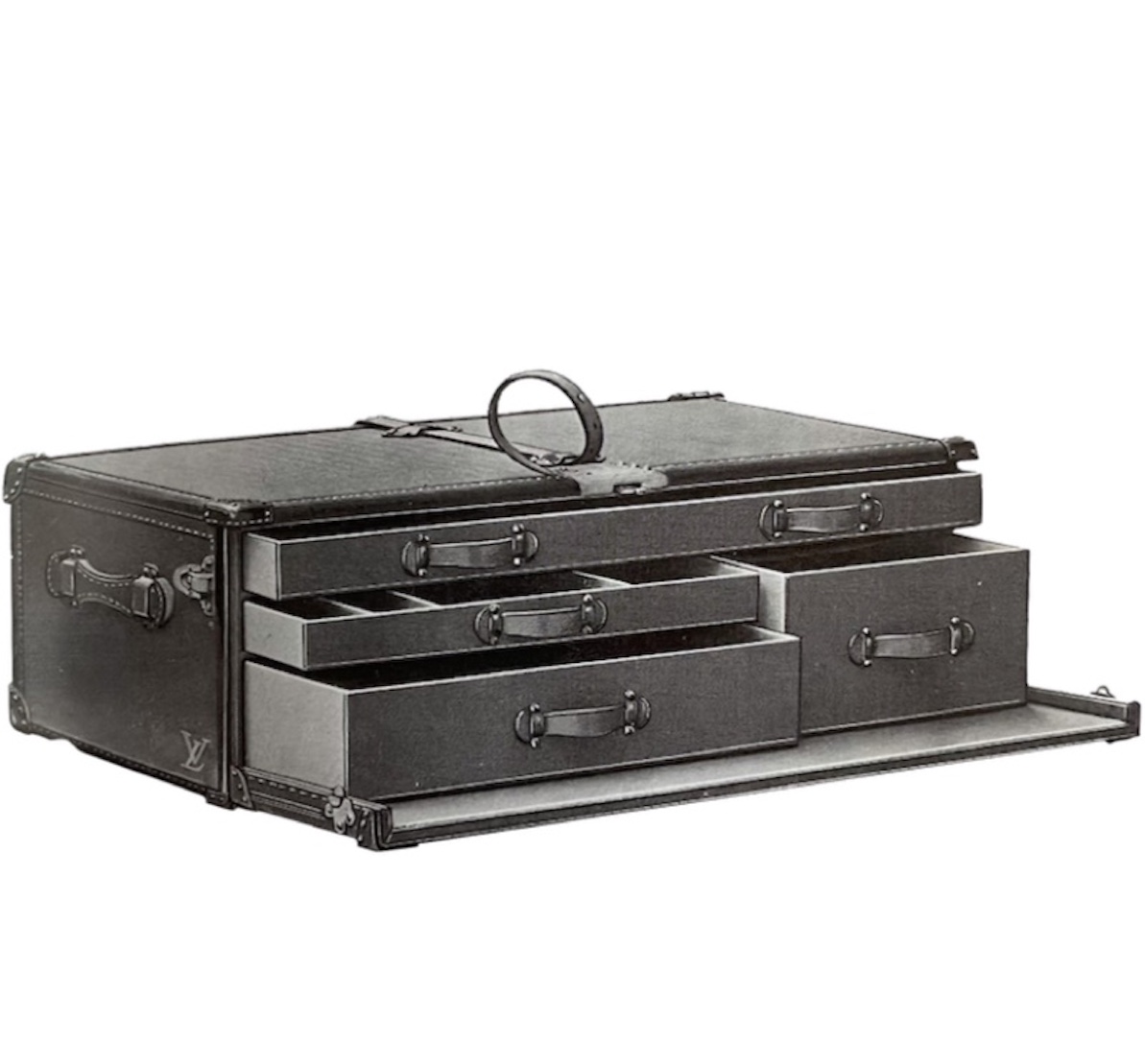 Imaginé par Gaston-Louis Vuitton lors d’un départ vers les Etats Unis dans les années 1910, ce modele permettait aux clients les plus fortunés d’accéder directement au contenu de leurs malles sans jamais y toucher. Entreprosé sous la couchette pendant le voyage, le contenu était accesible simplement graçe à la porte basculante.