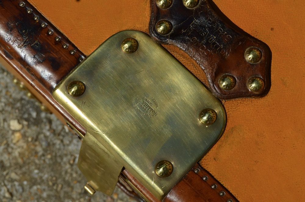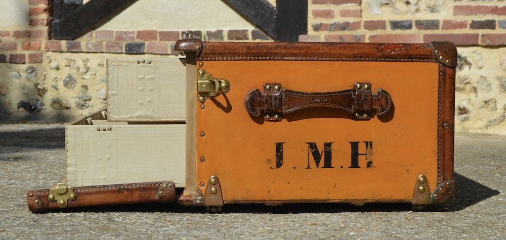 On remarque les initiales du propriétaire d’origine J.M.H sur chacun des côtés, avec des roulettes en laiton signé Louis Vuitton et quatre très belles charnières en laiton sur la façade. Le dessous de la malle est estampillé Louis Vuitton, avec les différentes adresses de la boutique Louis Vuitton de l’époque.