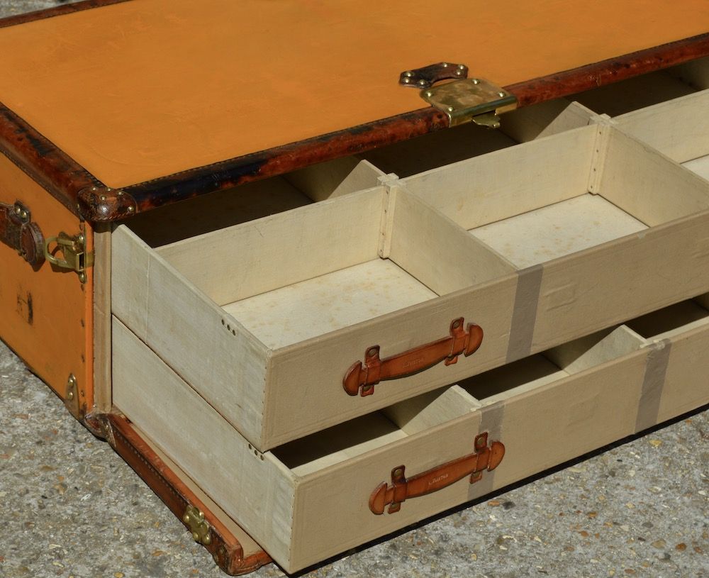 Rarissime malle commode ou malle à tiroirs Louis Vuitton des années 1910, de taille « cabine » recouverte d’une toile Vuitonite jaune. Protégée par des bordures en cuir, ce superbe modèle est équipé de deux poignées en cuir et de 4 passants signé Louis Vuitton pour fixer une sangle de sécurité. L’intérieur est équipé de deux châssis amovibles, originellement utilisé pour ranger des chaussures et des bottes. Les angles sont cousus selliers, avec un joint de protection à l’intérieur de la malle pour protéger le contenu du bagage de l’humidité lors d’un voyage en paquebot.