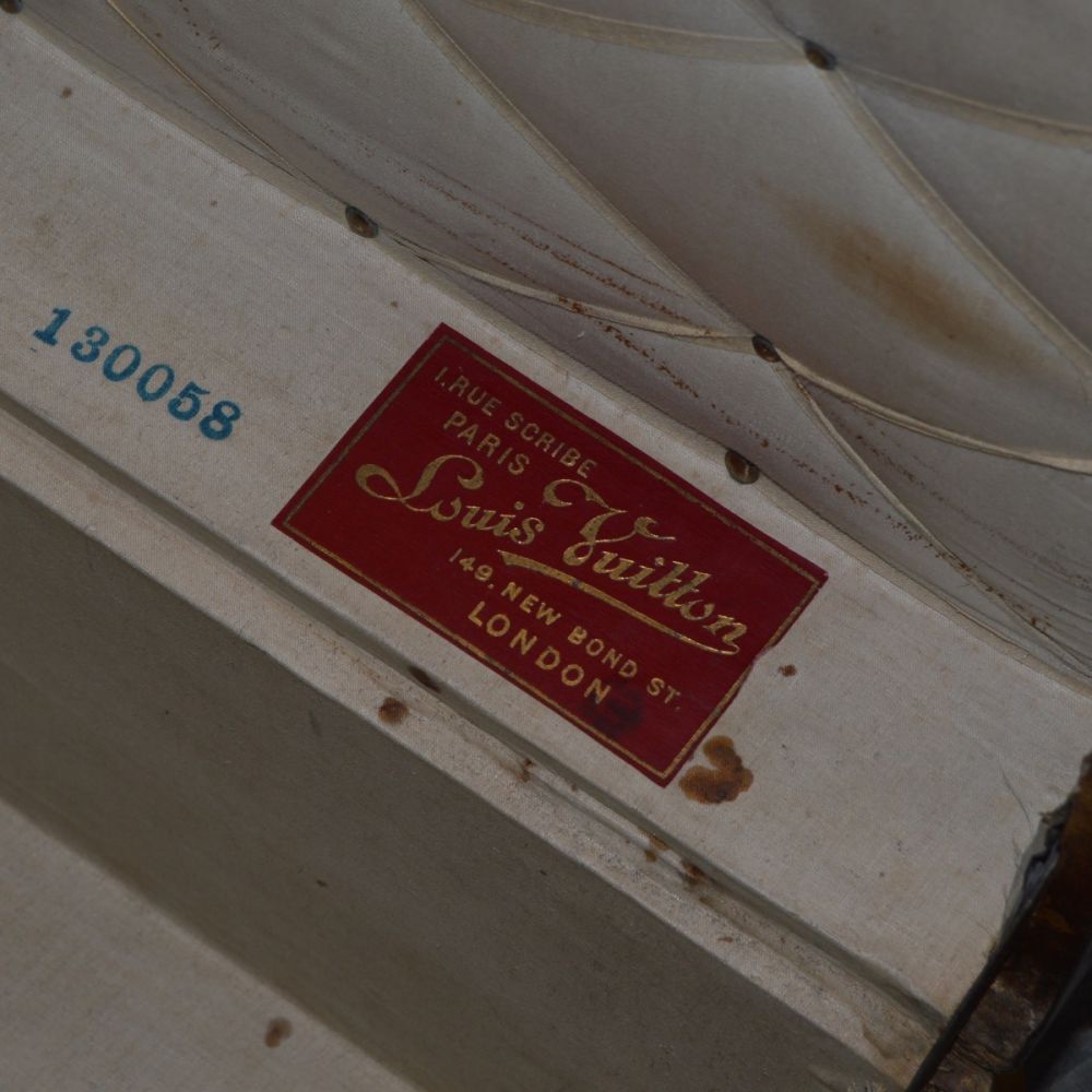 L’emblématique toile tissée jacquard, premier revêtement monogramme utilisé par la maison Louis Vuitton de 1896 à 1904. Cette toile très fragile et peu produite est aujourd’hui particulièrement compliquée à trouver en bon état. Les fermoirs sont en laiton, tandis que la bijouterie est métallique (finition mauresque). La serrure centrale est signée Louis Vuitton et numérotée, avec l’adresse des magasins de l’époque. Les initiales du propriétaire V.K sont peintes sur chacun des côtés. On retrouve également de nombreuses étiquettes d’hôtels sur le dessus et les cotés de la malle, témoignant de ces voyages en Europe.
