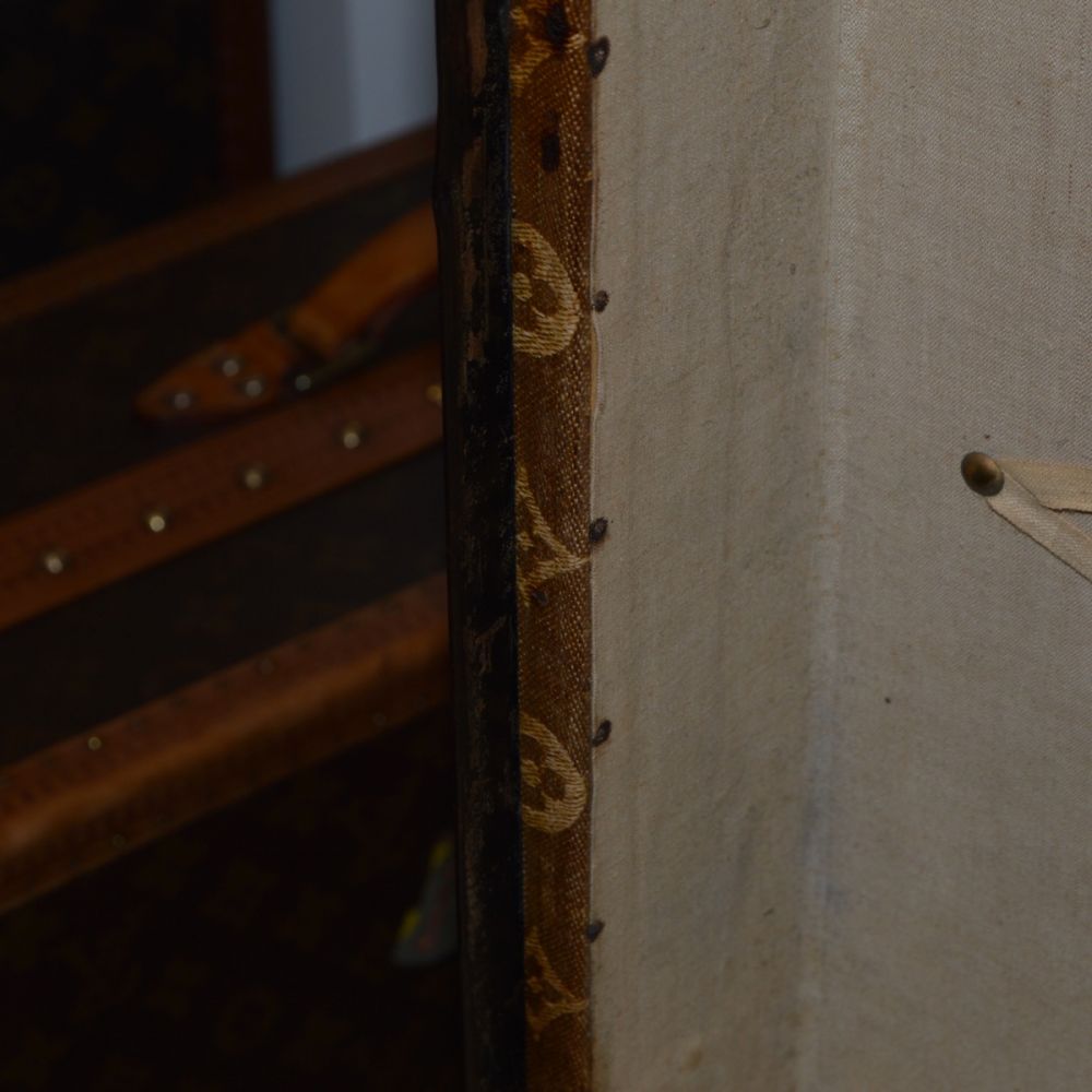 L’intérieur de la malle est capitonné pour permettre au client d’origine de fixer ses photos de famille ou son courrier. Le fond de la malle est recouvert d’une toile noire.