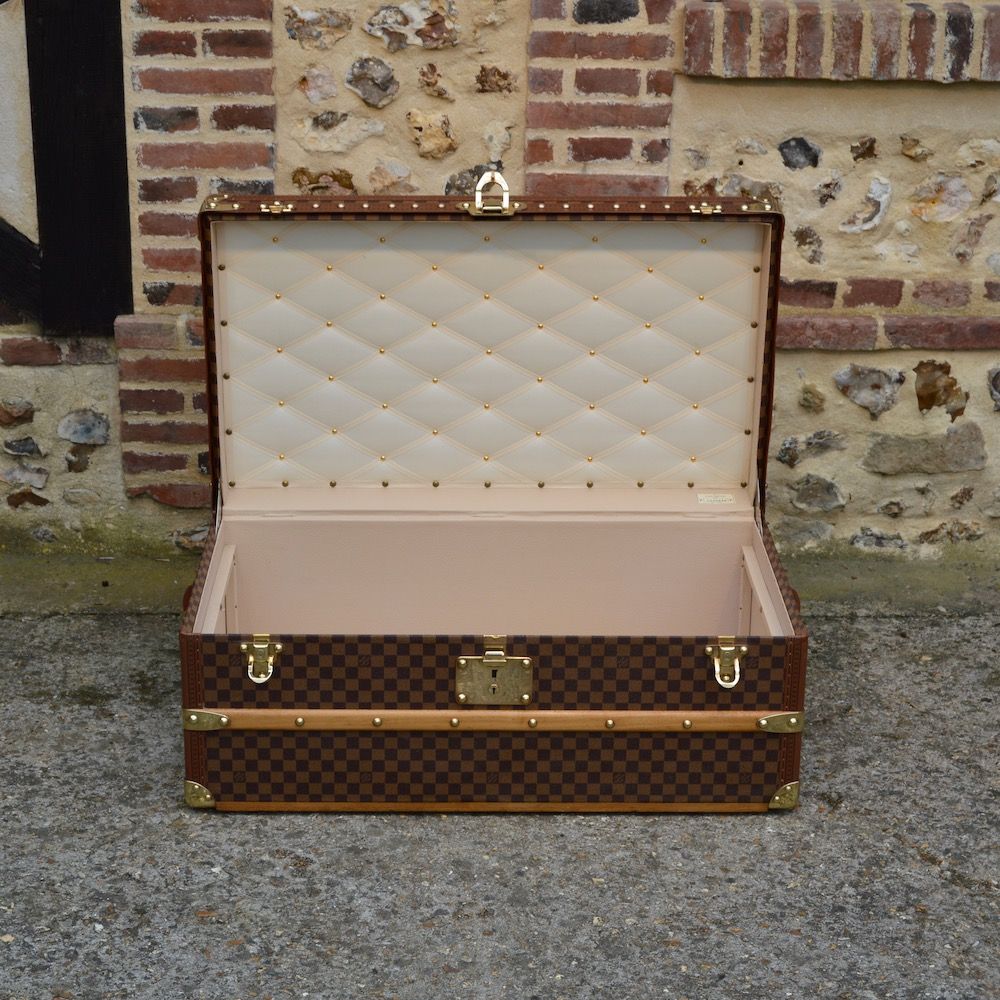 L’intérieur est doublé en vuittonite beige, avec un capitonnage dans le capot. On retrouve également l’étiquette d’authenticité Louis Vuitton avec le numéro de série de la malle.