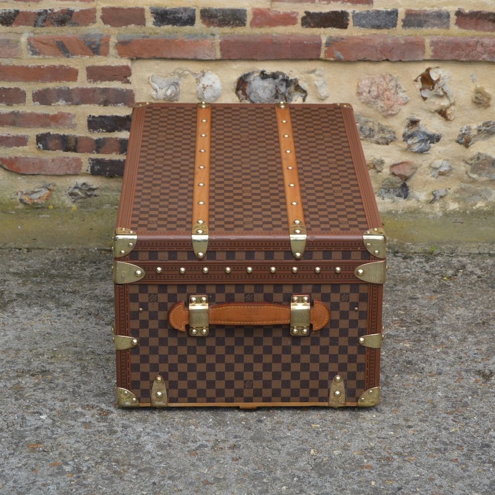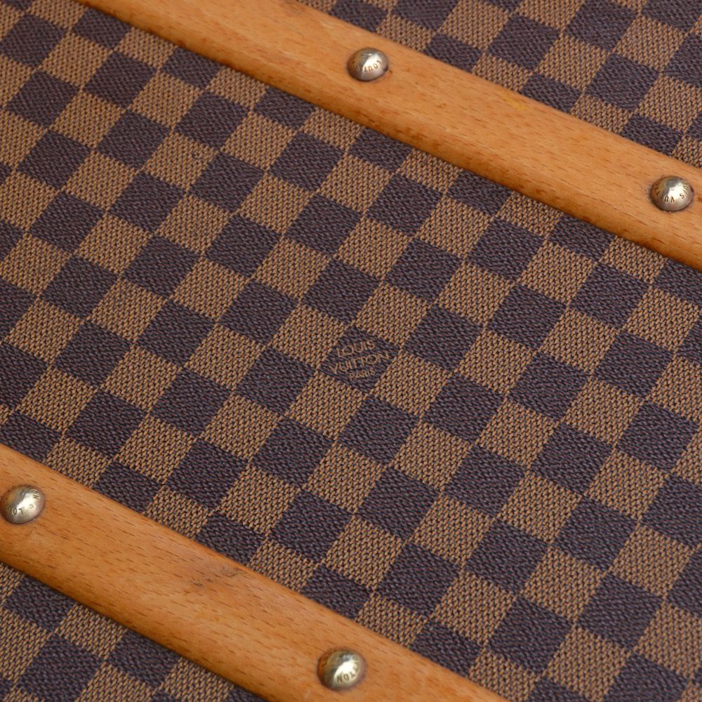 Malle cabine Louis Vuitton des années 1995 recouverte de la toile « damier ébène » et protégée par des bordures en lozine marron. La malle est équipée de bijouterie en laiton, avec 2 poignées en cuir estampillées « Louis Vuitton » fixées sur les côtés de la malle et 4 renforts fixés sur le dessous.
