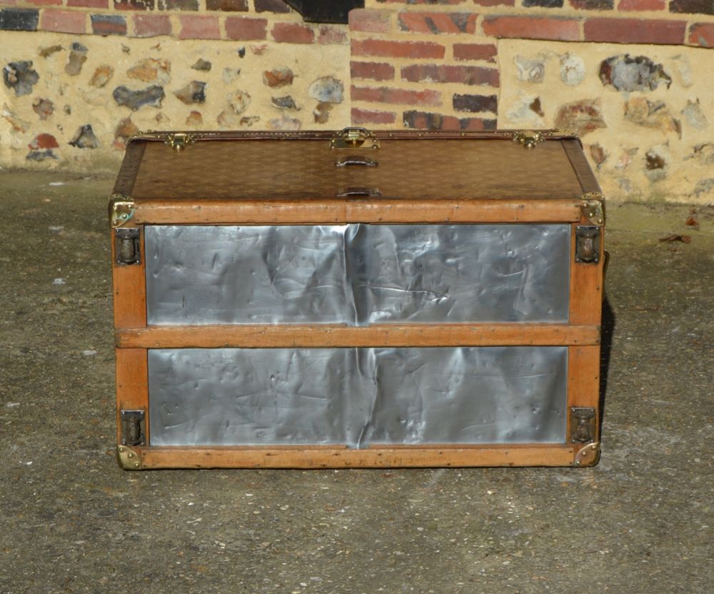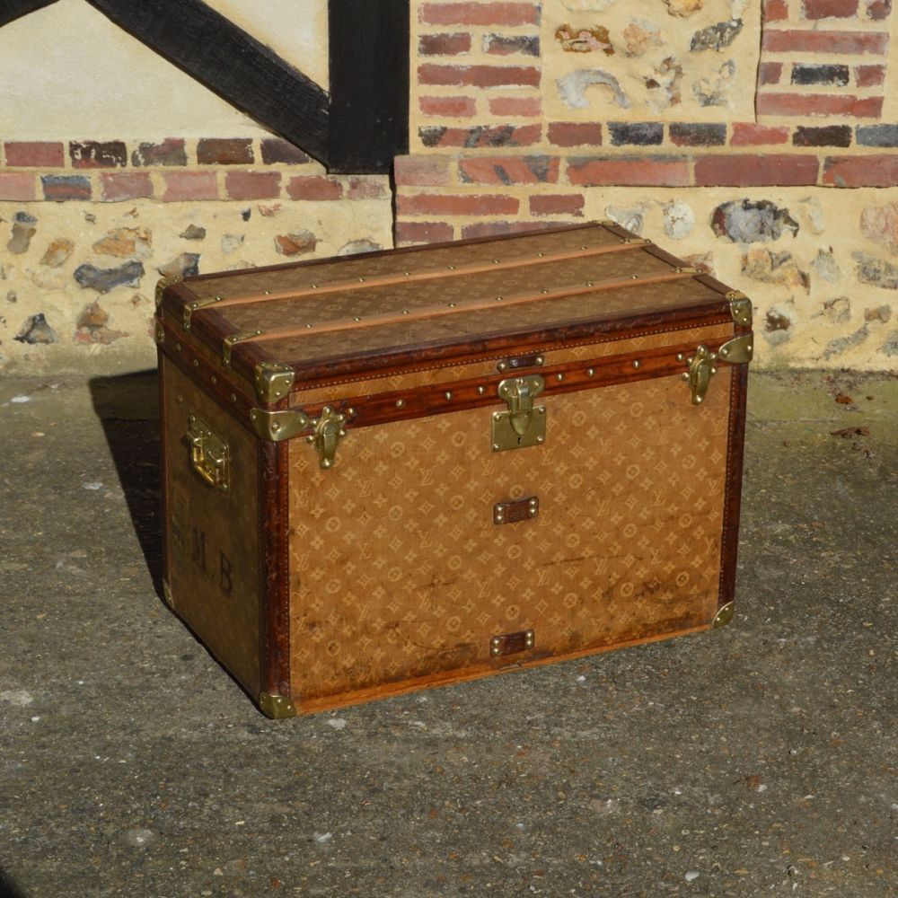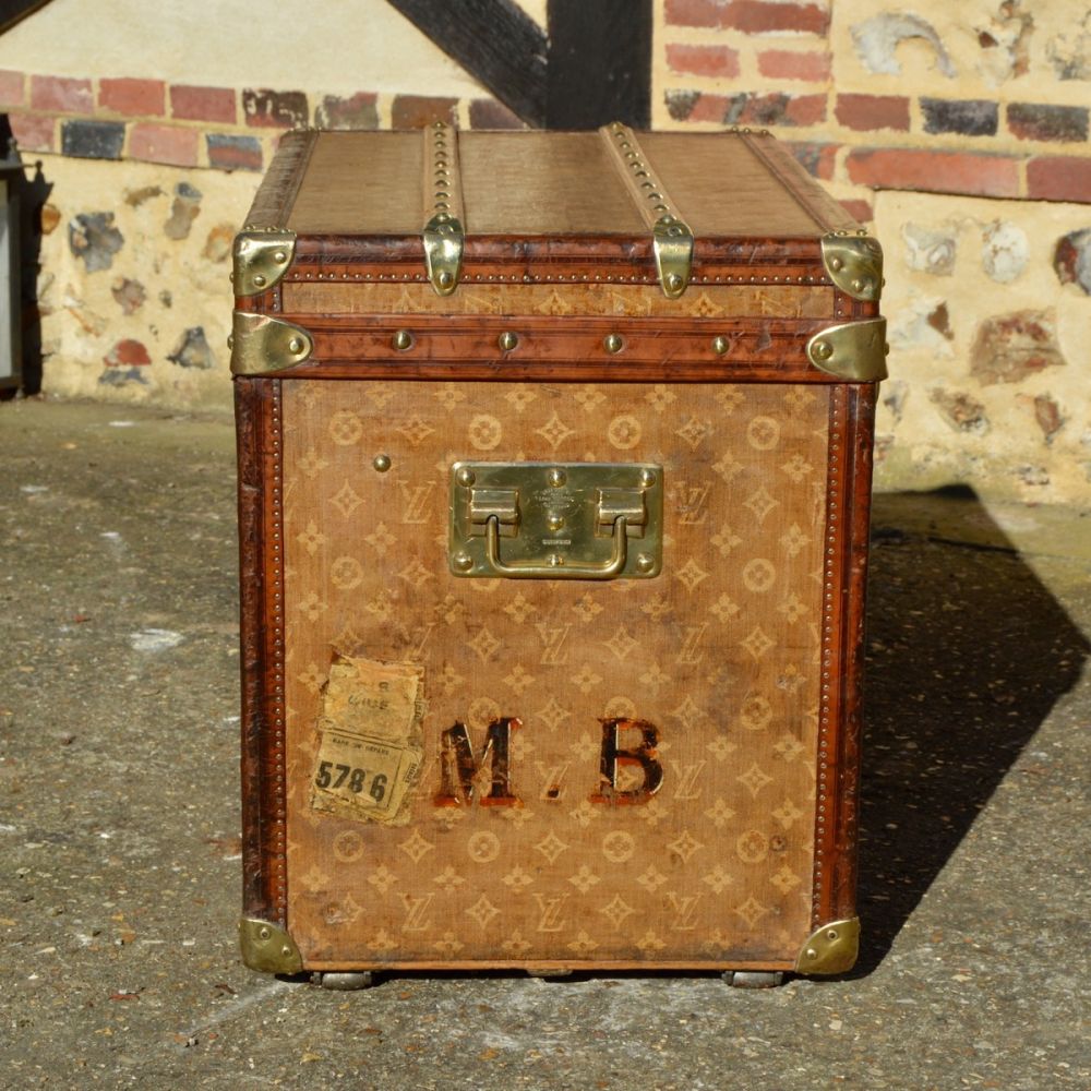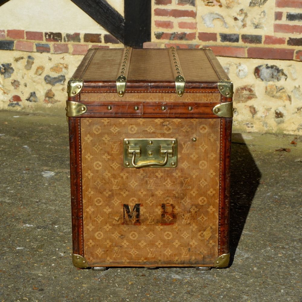 Superbe Malle Louis Vuitton de 1898 originellement utilisée pour transporter des chapeaux. La malle est recouverte d’une toile tissée jacquard, première toile monogramme de la maison Louis Vuitton, produite de 1896 à 1904 uniquement. On retrouve également des bordures en cuir, finition la plus luxueuse de l’époque et des bijouterie en laiton estampillées Louis Vuitton.