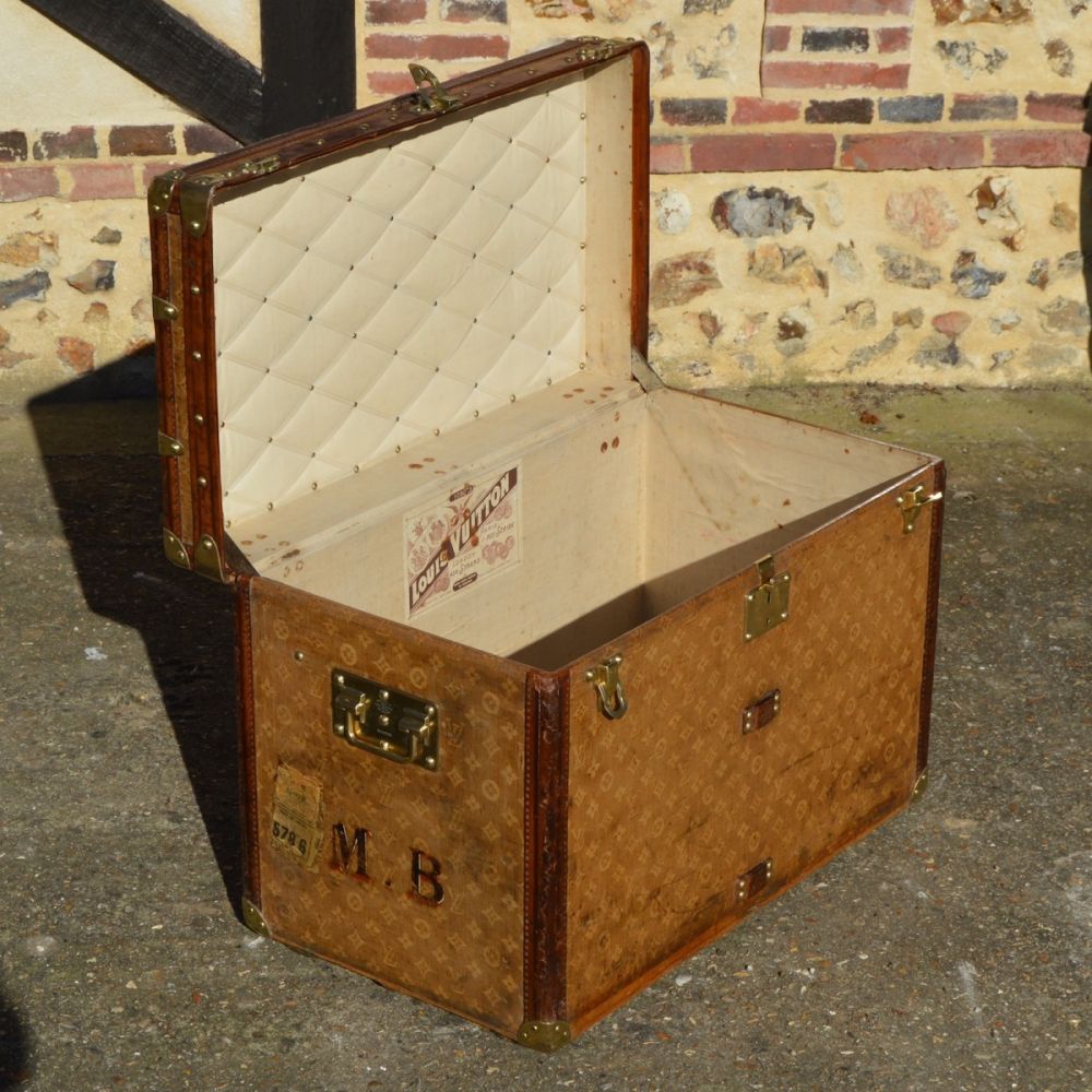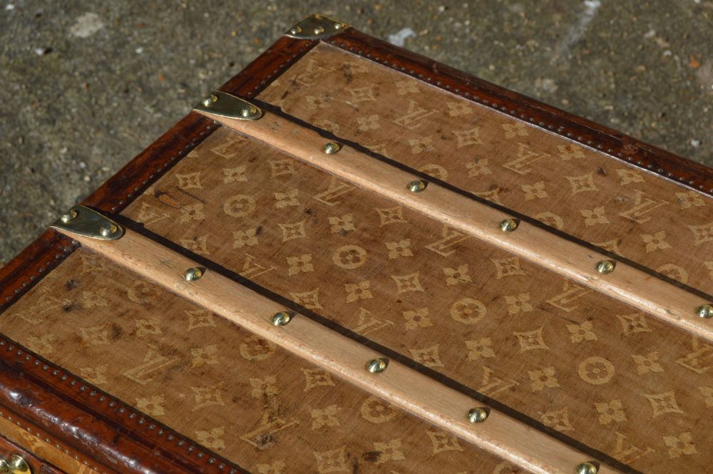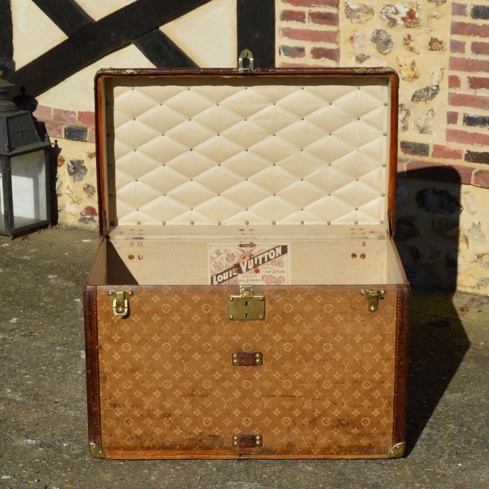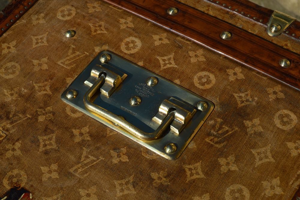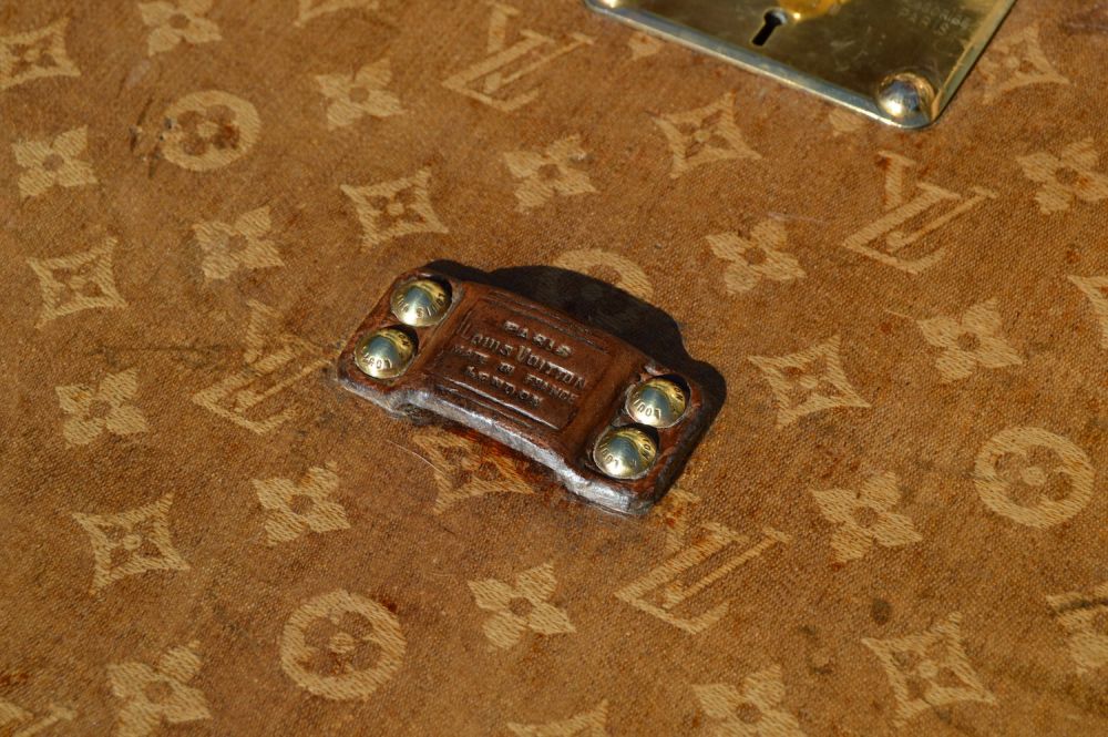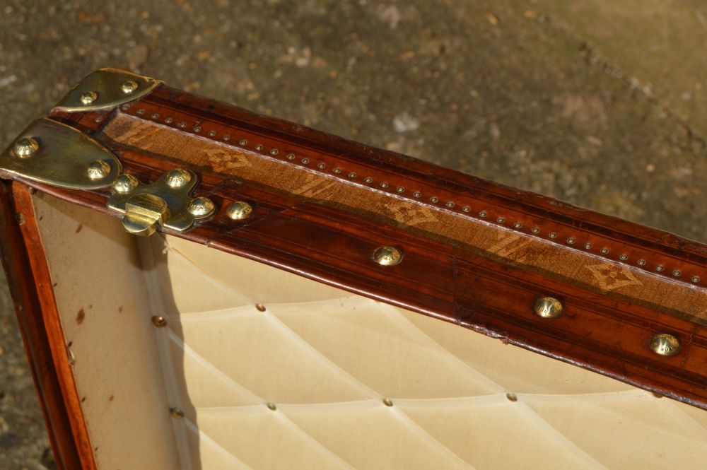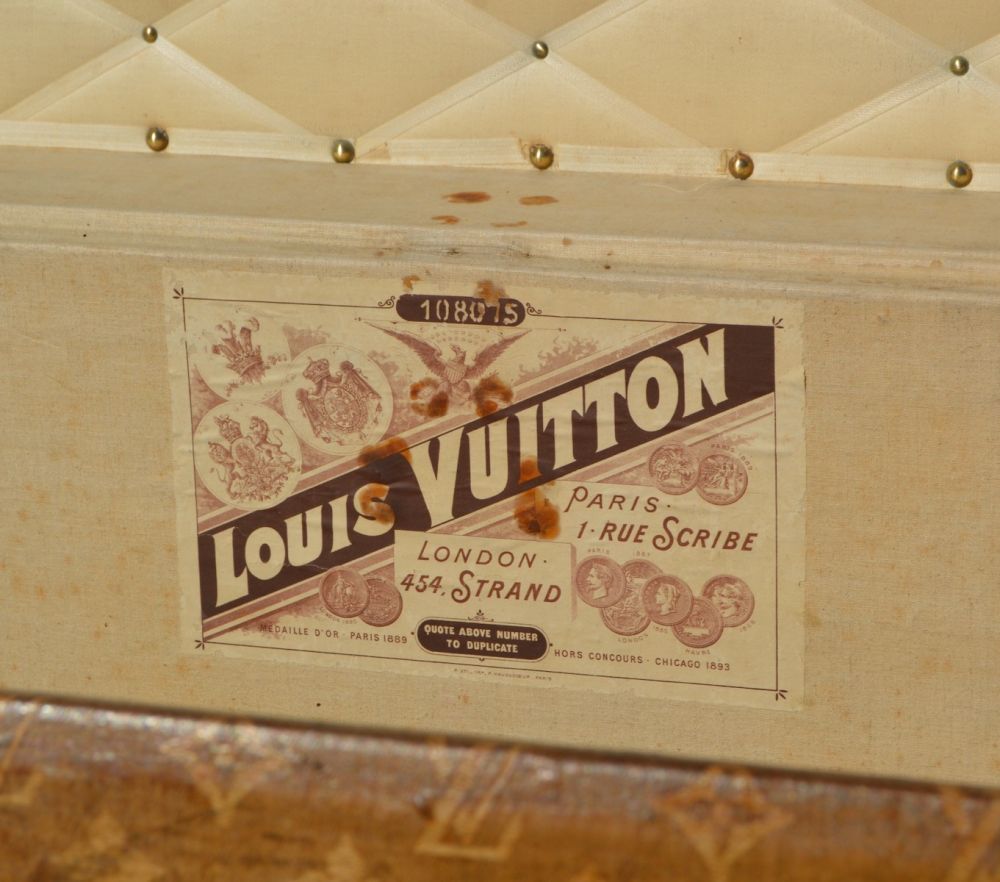L’intérieur est doublé en lin, avec un capitonnage pour fixer les photos de famille de la cliente d’origine. On retrouve également l'étiquette du fabricant Louis Vuitton, avec le numero de série Louis Vuitton, les différentes adresses de l’époque, ainsi que les médailles gagnées par louis vuitton aux Expositions Universelles de l’époque.