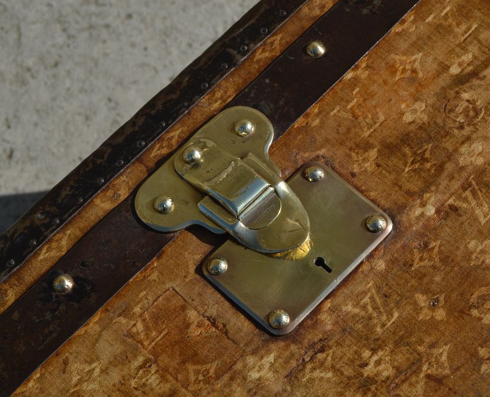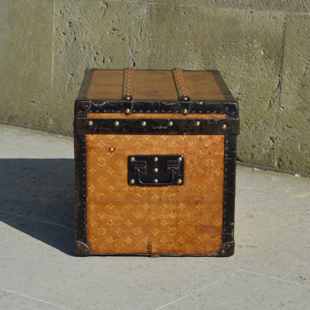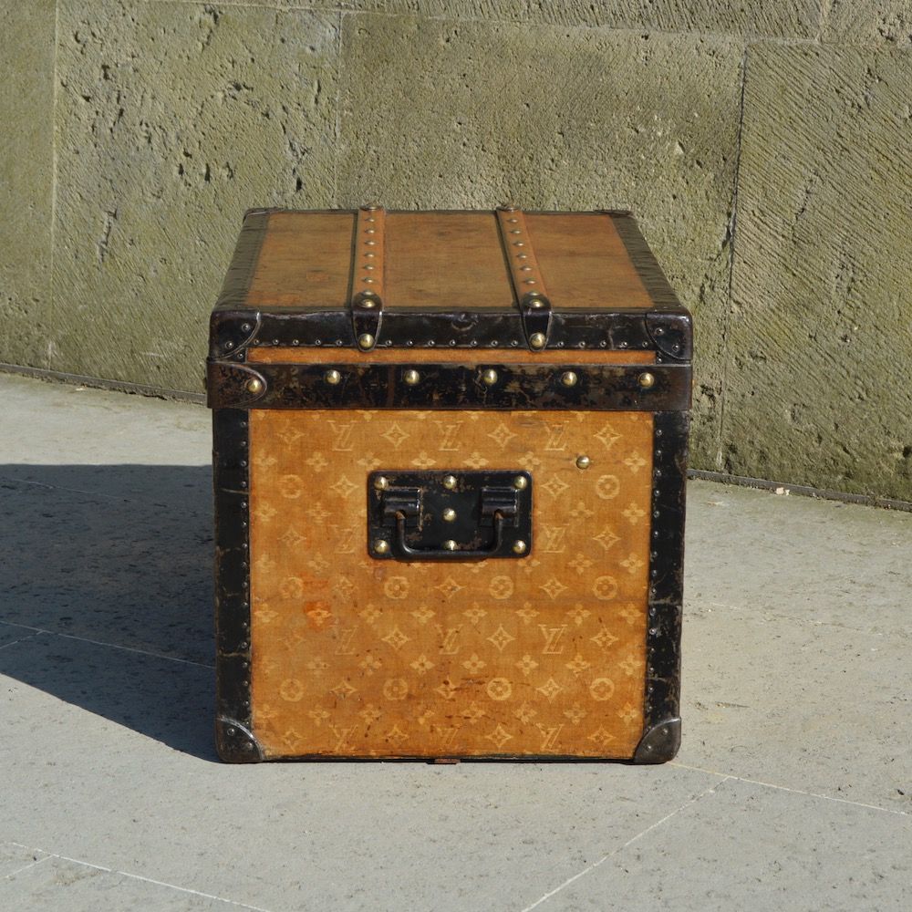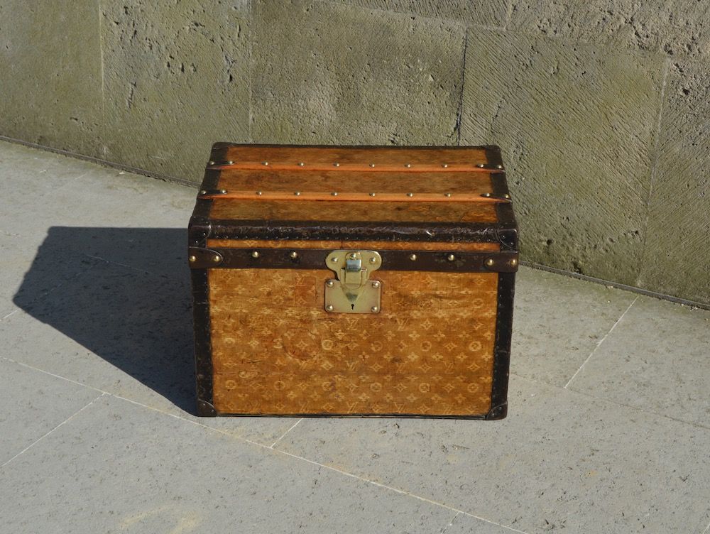Adorable petite Malle Louis Vuitton de 1904, recouverte de la première toile monogramme utilisée par Louis Vuitton, la toile tissée Jacquard (produite seulement de 1896 à 1904).