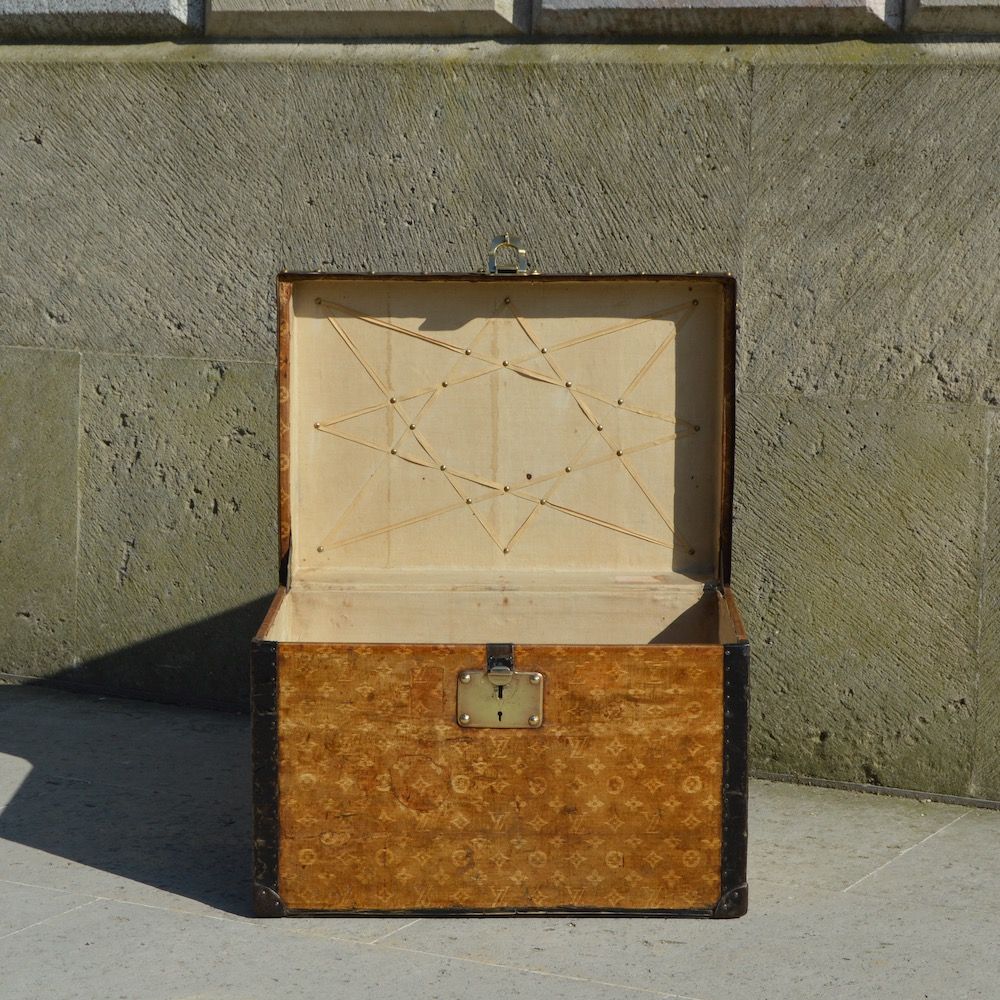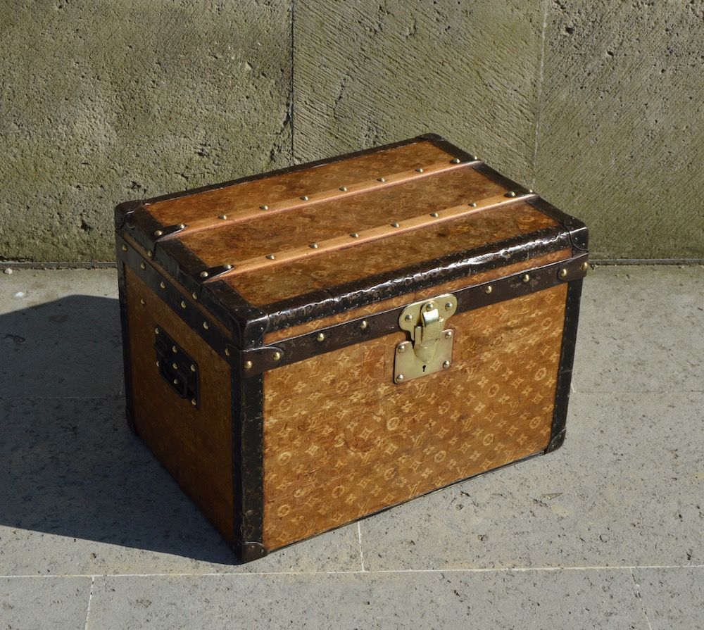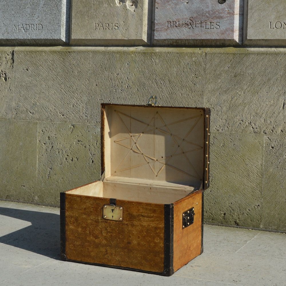 Adorable petite Malle Louis Vuitton de 1904, recouverte de la première toile monogramme utilisée par Louis Vuitton, la toile tissée Jacquard (produite seulement de 1896 à 1904).