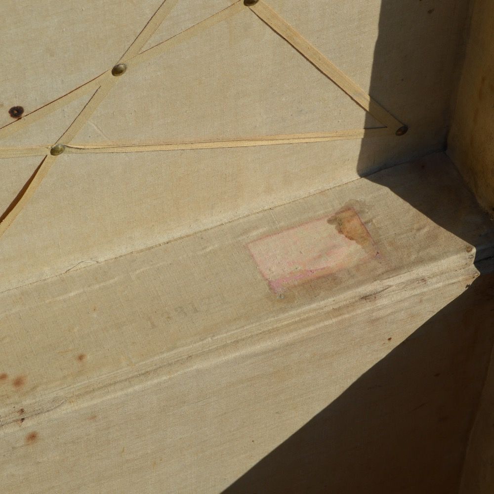 Bon état : La malle est en bon état pour son âge, avec une très belle patine de la toile. On remarque quelques restaurations antérieures avec des petits greffons de toile similaire.