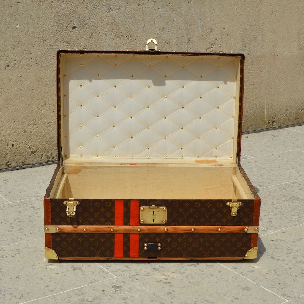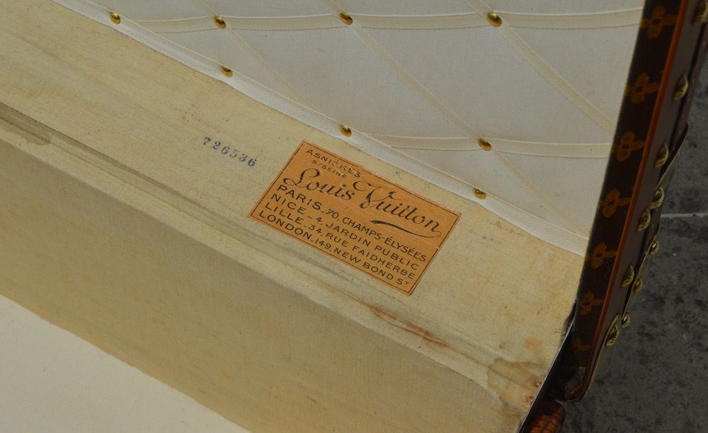 L’intérieur de la malle est recouvert d’une toile de coton, avec un capiton dans le capot, restauré à l’identique de celui d’origine. On y retrouve l’étiquette d’authenticité Louis Vuitton ainsi que le numéro de série.