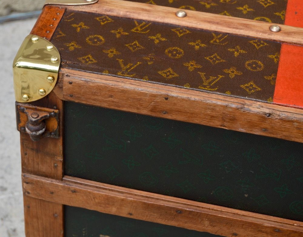 La principale particularité de cette pièce étant la toile collée sur le fond du bagage. Il s’agit d’une toile monogramme LV Vert et Bleu, revêtement extrêmement rare utilisé par Louis Vuitton sur quelque commande spéciale. Cette toile était probablement sous la main de l’artisan lors de la fabrication de la malle. C’était classique à l’époque de récupérer des morceaux de toile pour recouvrir le fond d’un bagage, la partie la moins importante, et nous remercions cet artisan aujourd’hui d’avoir choisi cet échantillon !