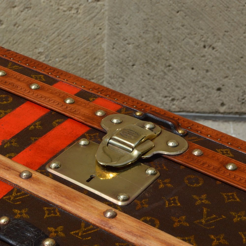 Superbe malle cabine Louis Vuitton de 1916 protégée par des bordures Lozine marron et recouverte d’une toile monogramme aux pochoirs. La malle est équipée de bijouterie en laiton, avec trois fermoirs principaux estampillés « Louis Vuitton Paris » .