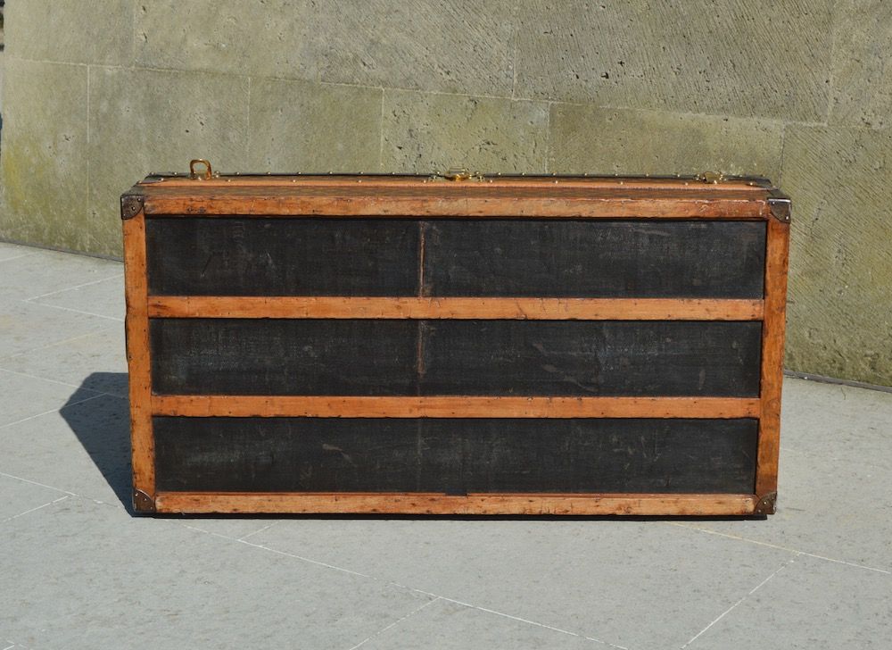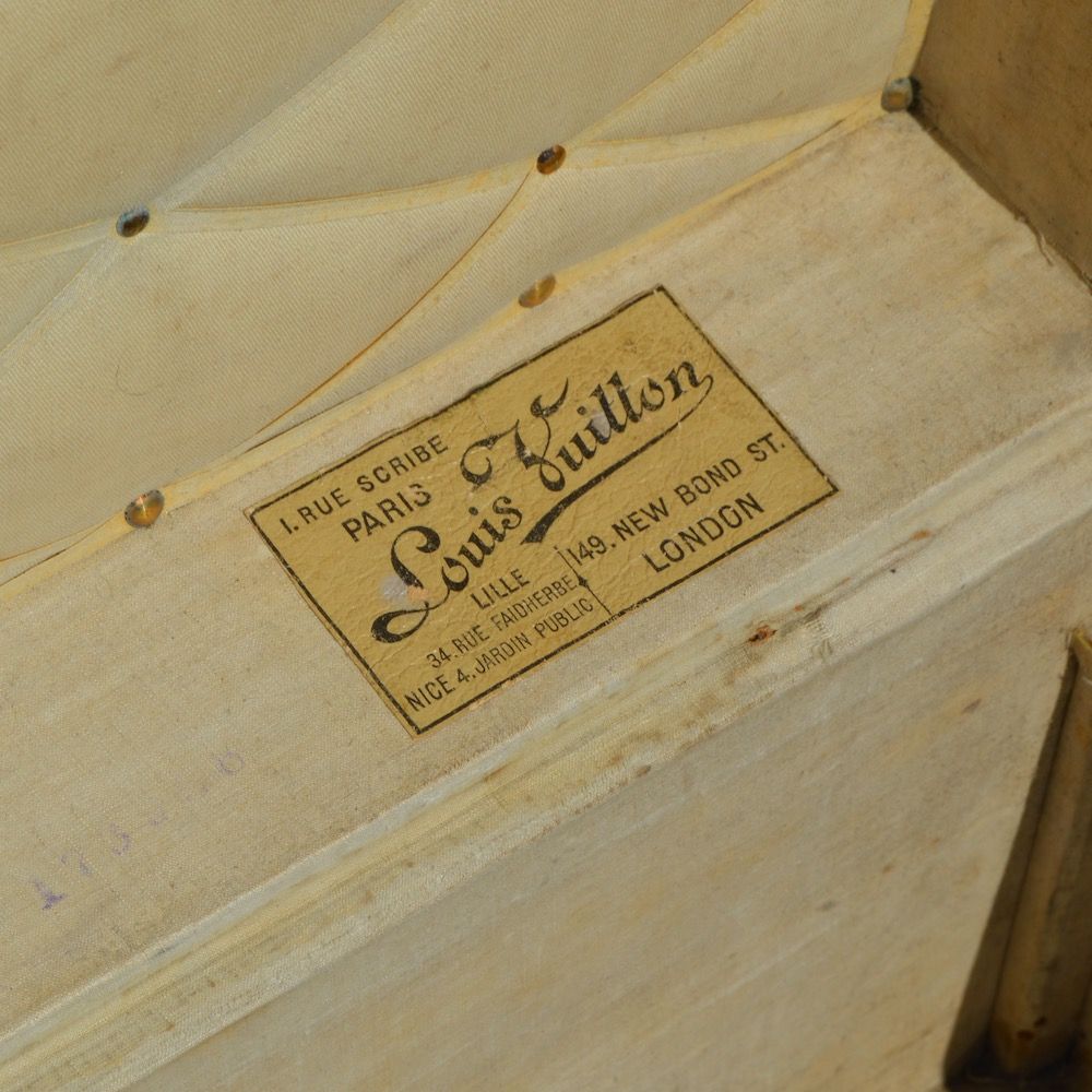L'intérieur de la malle est recouvert d'une toile de coton beige, avec l'étiquette du fabricant Louis Vuitton indiquant les différentes adresses des magasins de l'époque ainsi que le numéro d'authentification correspondant à l'année 1910.