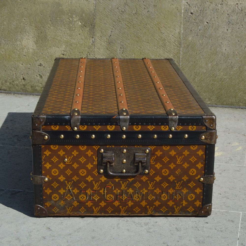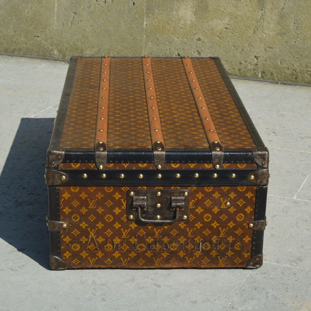 Superbe Malle de voyage Louis Vuitton de 1910, recouverte d'une toile enduite monogramme au pochoir jaune et protégée par des bordures lozine noires. La malle est équipée de trois fermoirs en laiton estampillé "Louis Vuitton" ainsi que de cornières métalliques pour assurer une grande solidité pendant le voyage. La serrure centrale semble avoir été changée par Louis Vuitton, elle est numéroté/gravé mais un peu plus récente que la serrure d'origine.