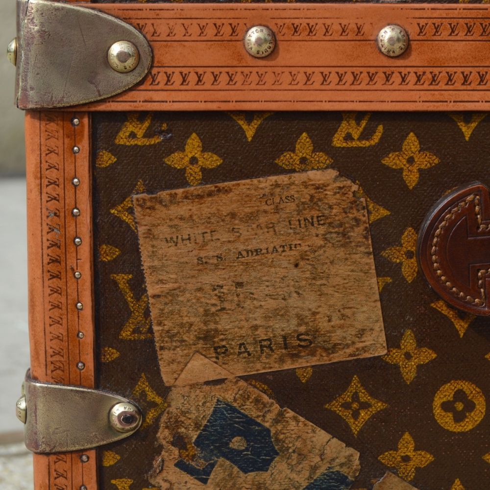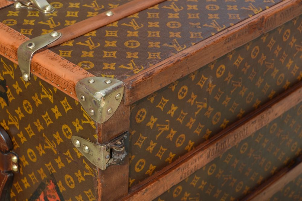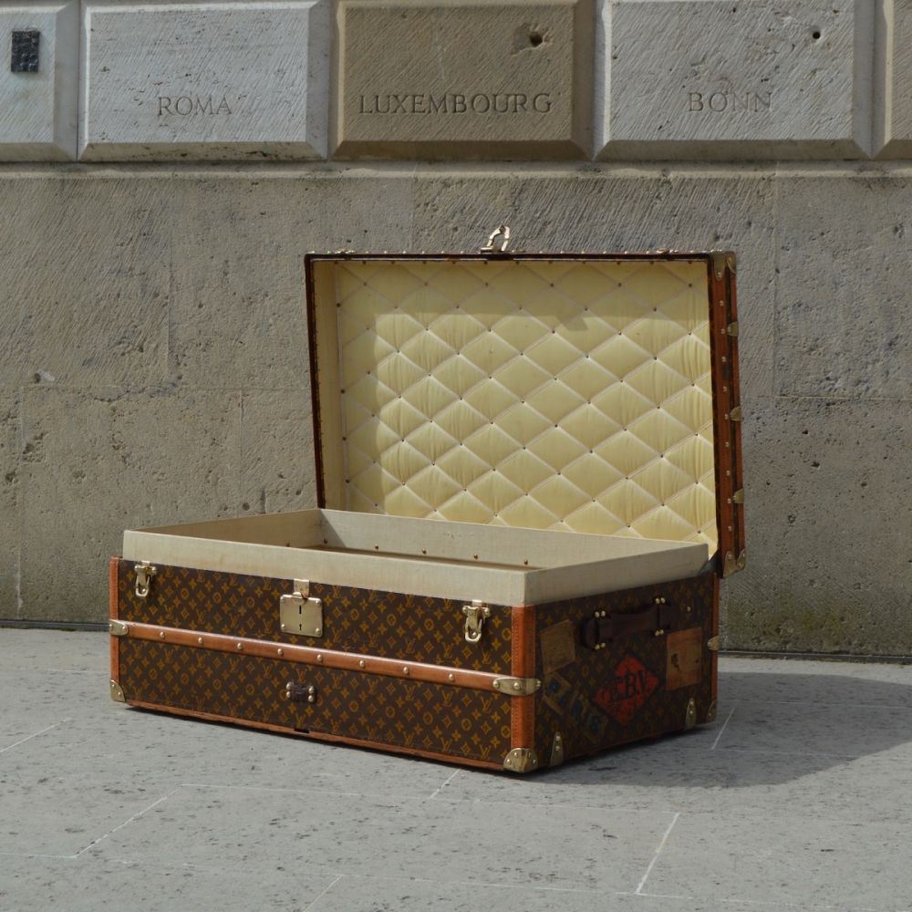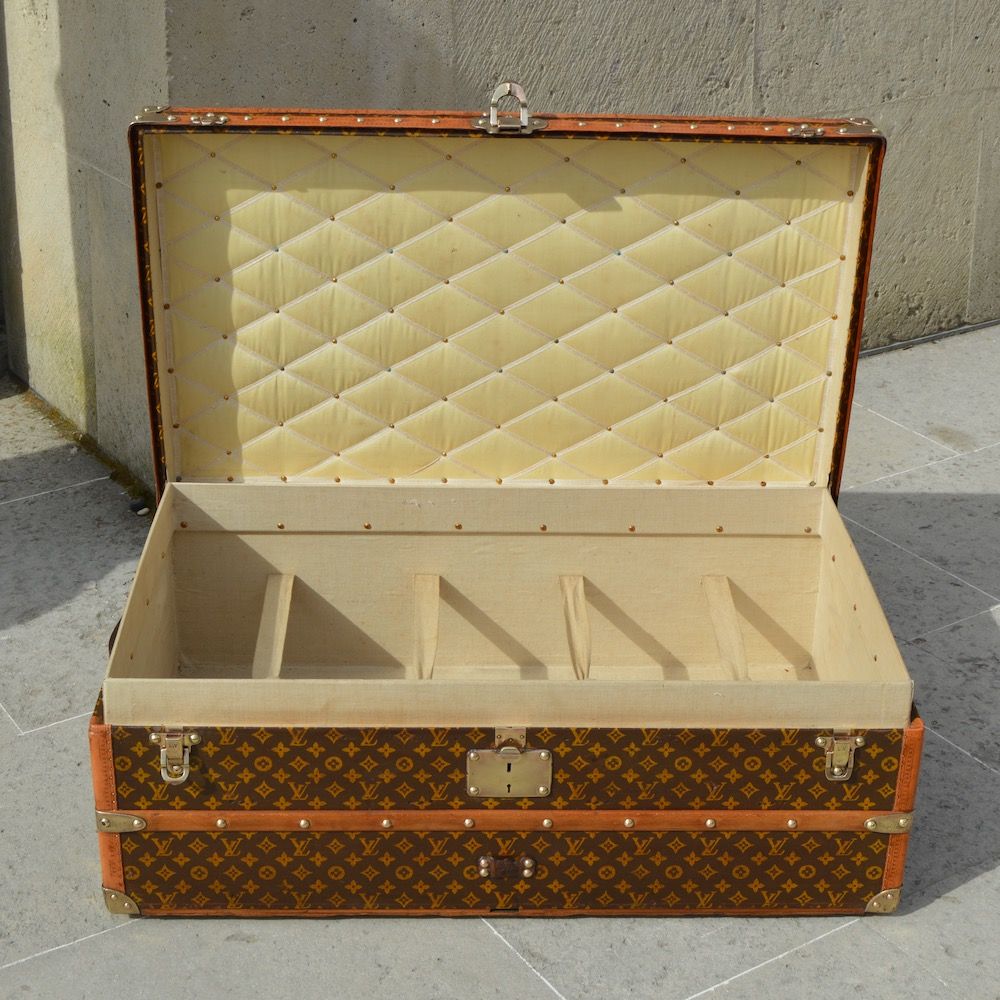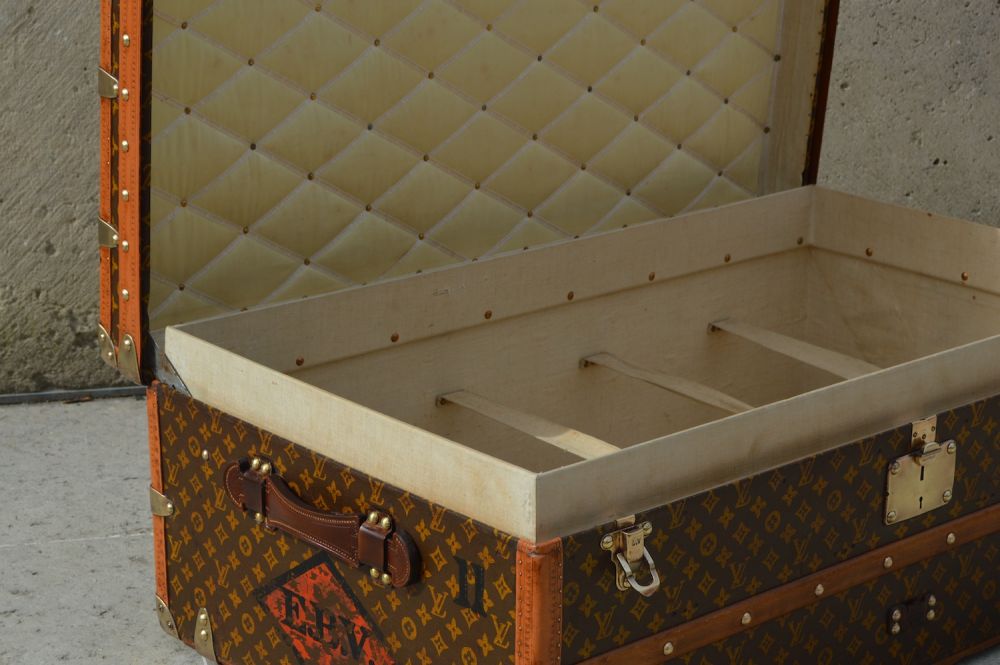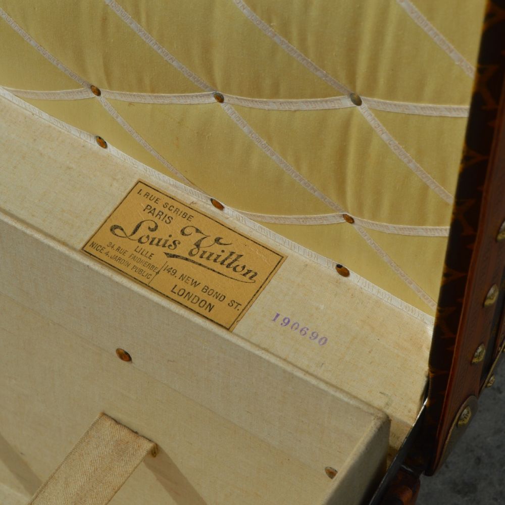 L’intérieur de la malle est doublé d’une toile de coton beige, avec le capitonnage d’origine monogrammée « Louis Vuitton » et les quatre sangles de maintien pour fixer les vêtements pendant le voyage. L’étiquette d’authenticité de la malle avec les différentes adresses des magasins Louis Vuitton de l’époque est visible à l’intérieur, ainsi que le numéro de série du bagage peint sur la toile.