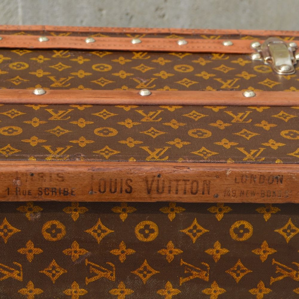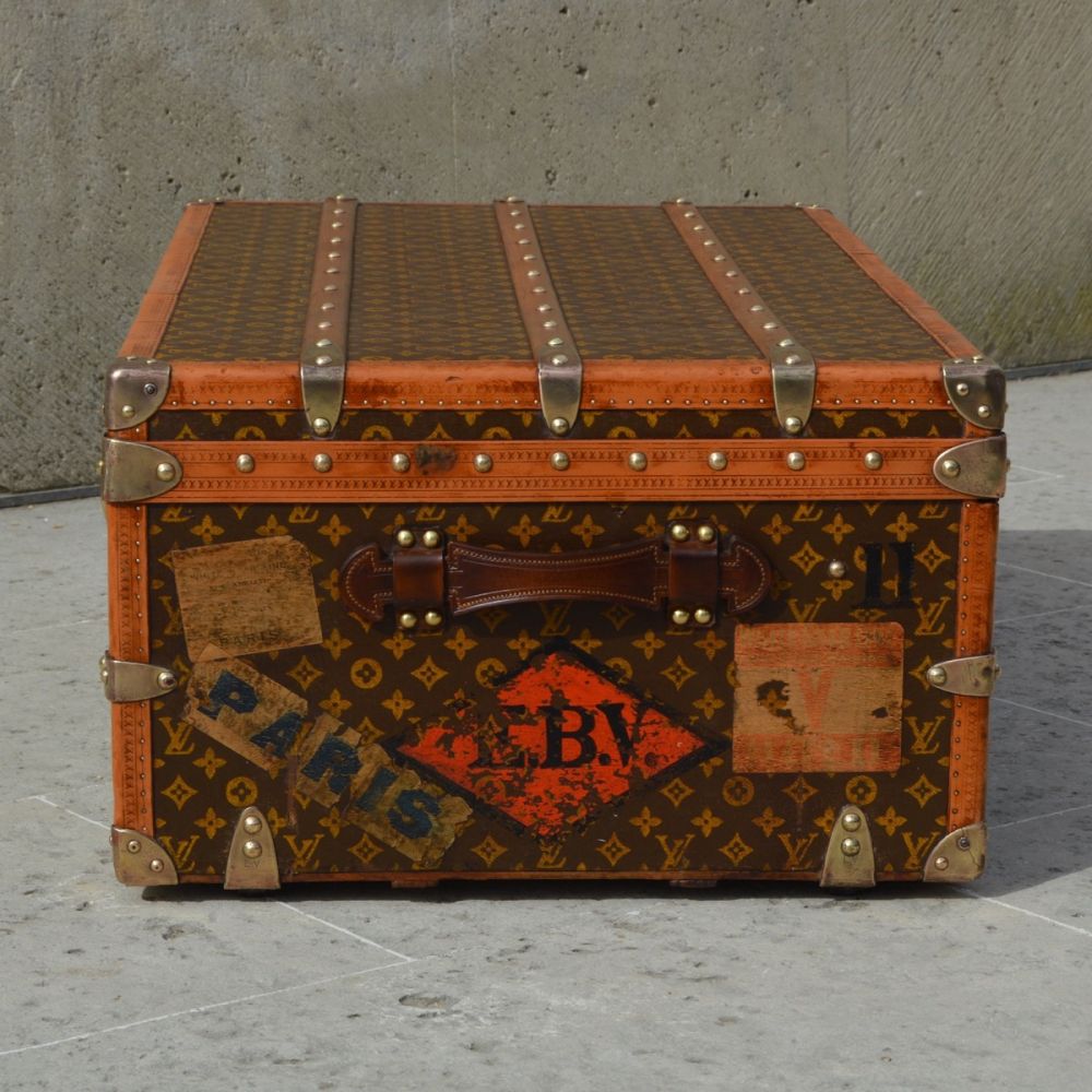 Rare malle Louis Vuitton des années 1913, d’un format intermédiaire entre la malle cabine et la malle courrier. On retrouve sur cette malle des bordures en lozine, avec une toile enduite monogramme au pochoir et des pièces en laiton estampillées Louis Vuitton. Les deux poignées en cuir sont restaurées à l’identique des pièces d’origine.
