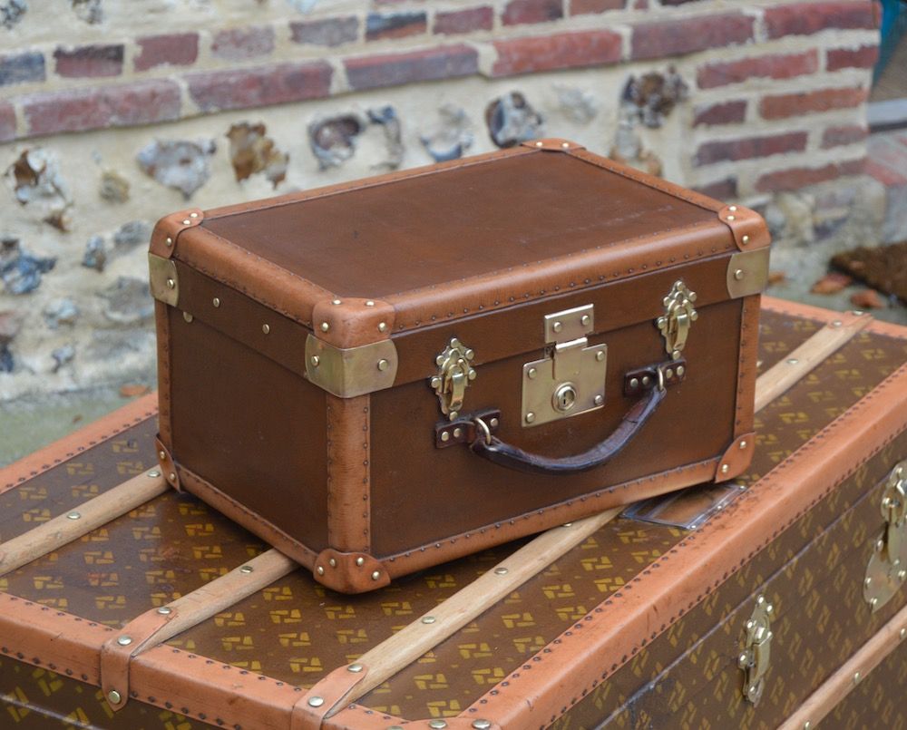 Très bon état : Cette petite malle est en très bel état, avec une fine patine du cuir sur la poignée.