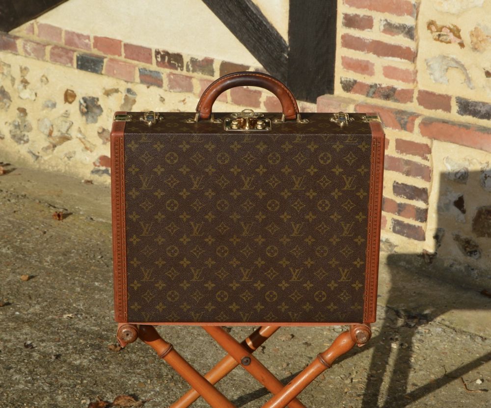 Valise Louis Vuitton modèle président des années 1980, recouverte d'une toile enduite monogramme et protégée par des bordures lozine. Modèle emblématique de la maison Louis Vuitton, avec une poignée en cuir et la clé d’origine. On retrouve une sangle en cuir à l’intérieur de la valise pour maintenir des documents. La cuve est recouverte d’une toile vuittonite beige.